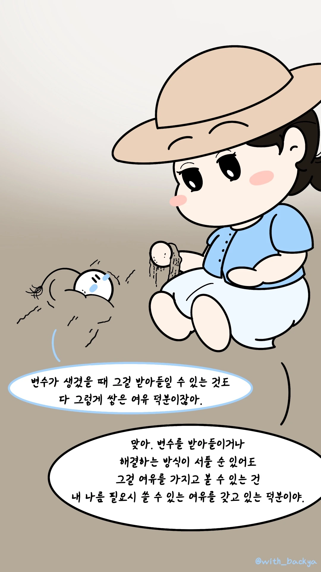 빈아_맞아. 변수를 받아들이거나 해결하는 방식이 서툴 순 있어도 그걸 여유를 가지고 볼 수 있는 건 내 나름 필요시 쓸 수 있는 여유를 갖고 있는 덕분이야.