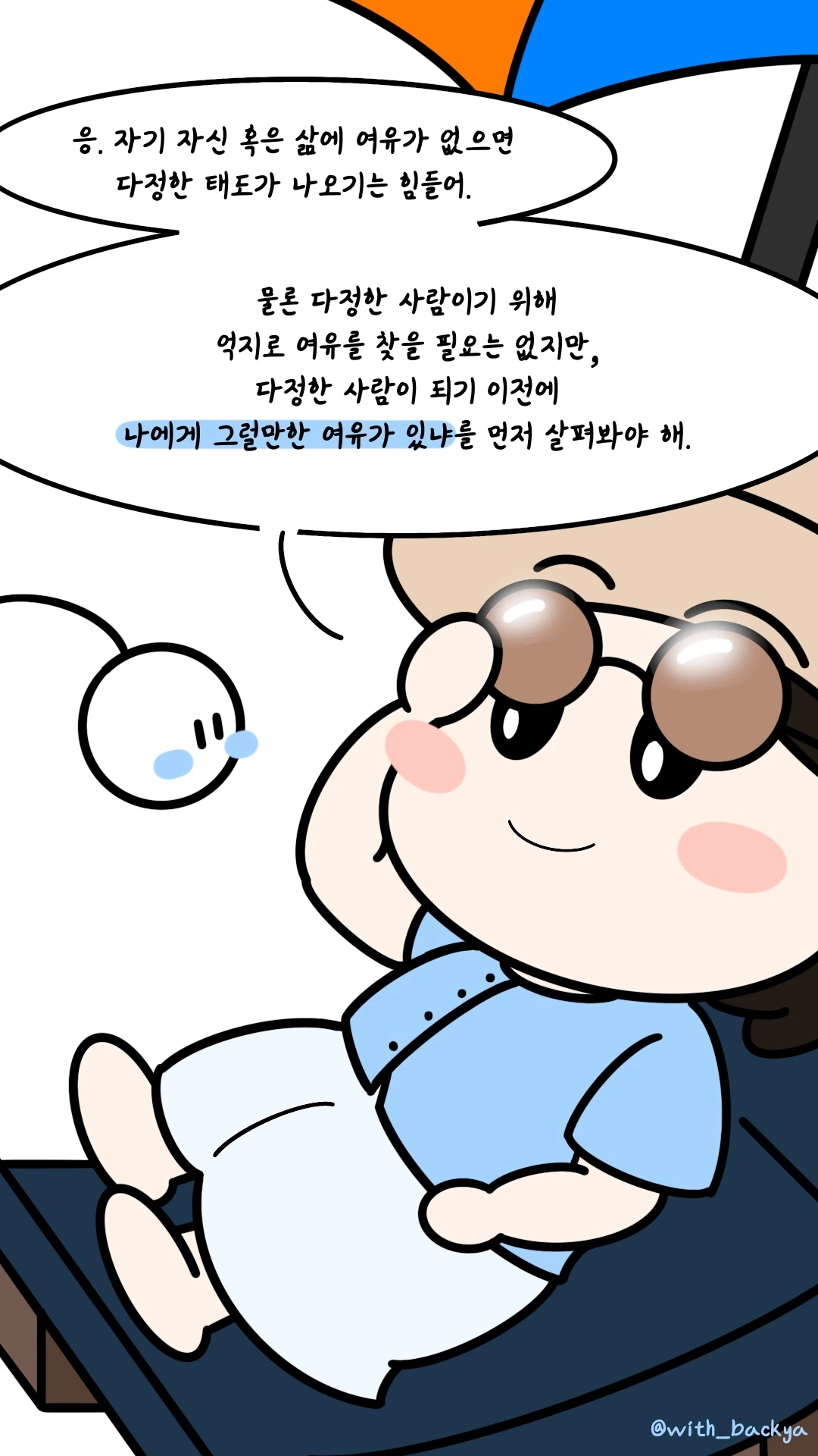 빈아_응. 자기 자신 혹은 삶에 여유가 없으면 다정한 태도가 나오기는 힘들어. 물론 다정한 사람이기 위해 억지로 여유를 찾을 필요는 없지만, 다정한 사람이 되기 이전에 나에게 그럴만한 여유가 있냐를 먼저 살펴봐야 해.
