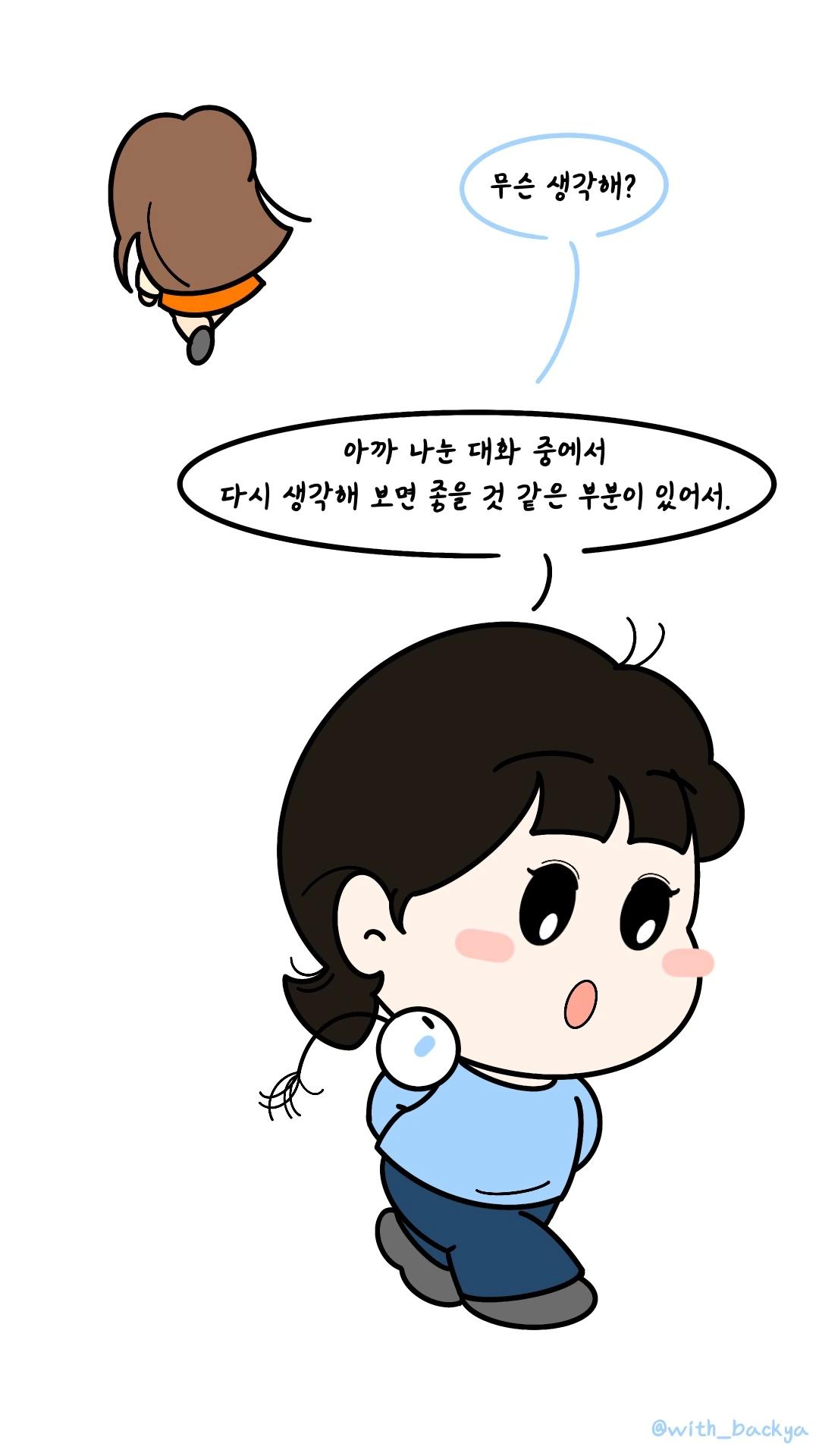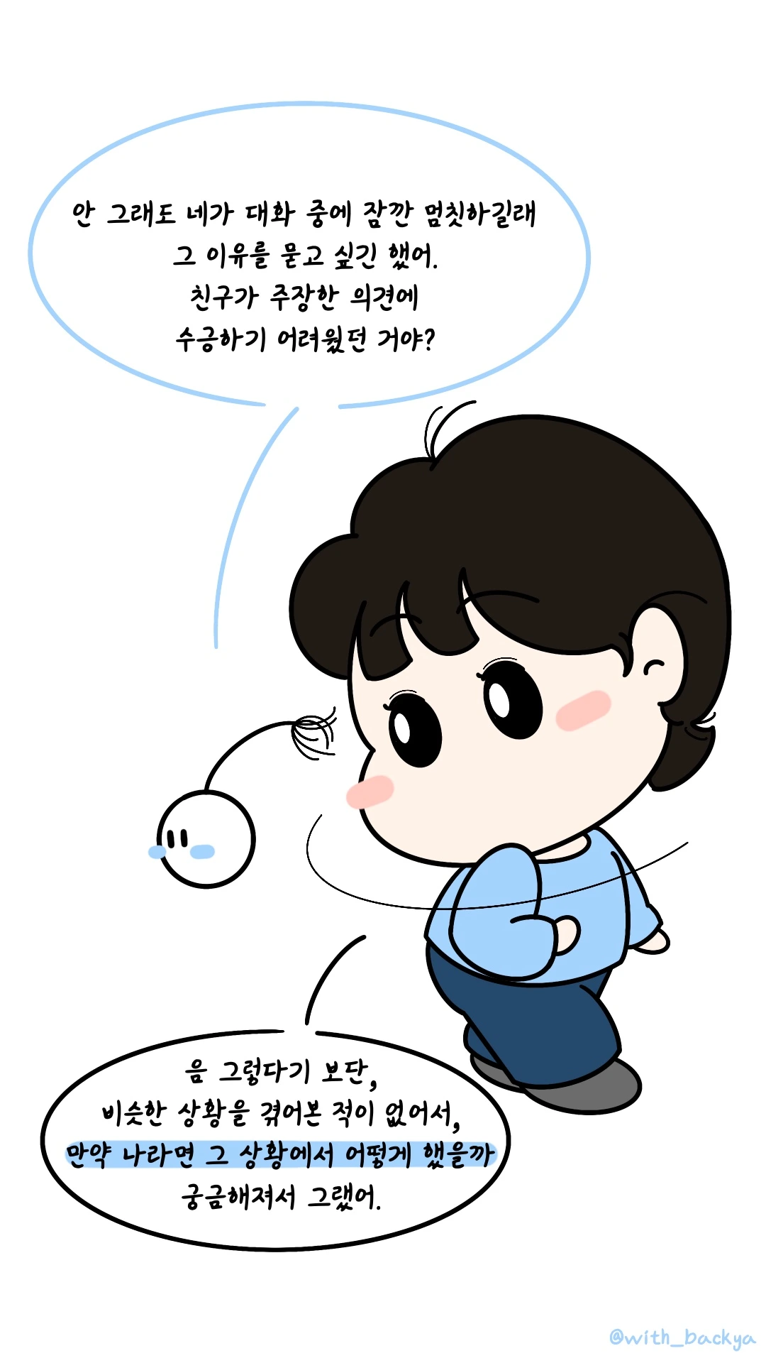 백야_안 그래도 네가 대화 중에 잠깐 멈칫하길래 그 이유를 묻고 싶긴 했어. 친구가 주장한 의견에 수긍하기 어려웠던 거야?
