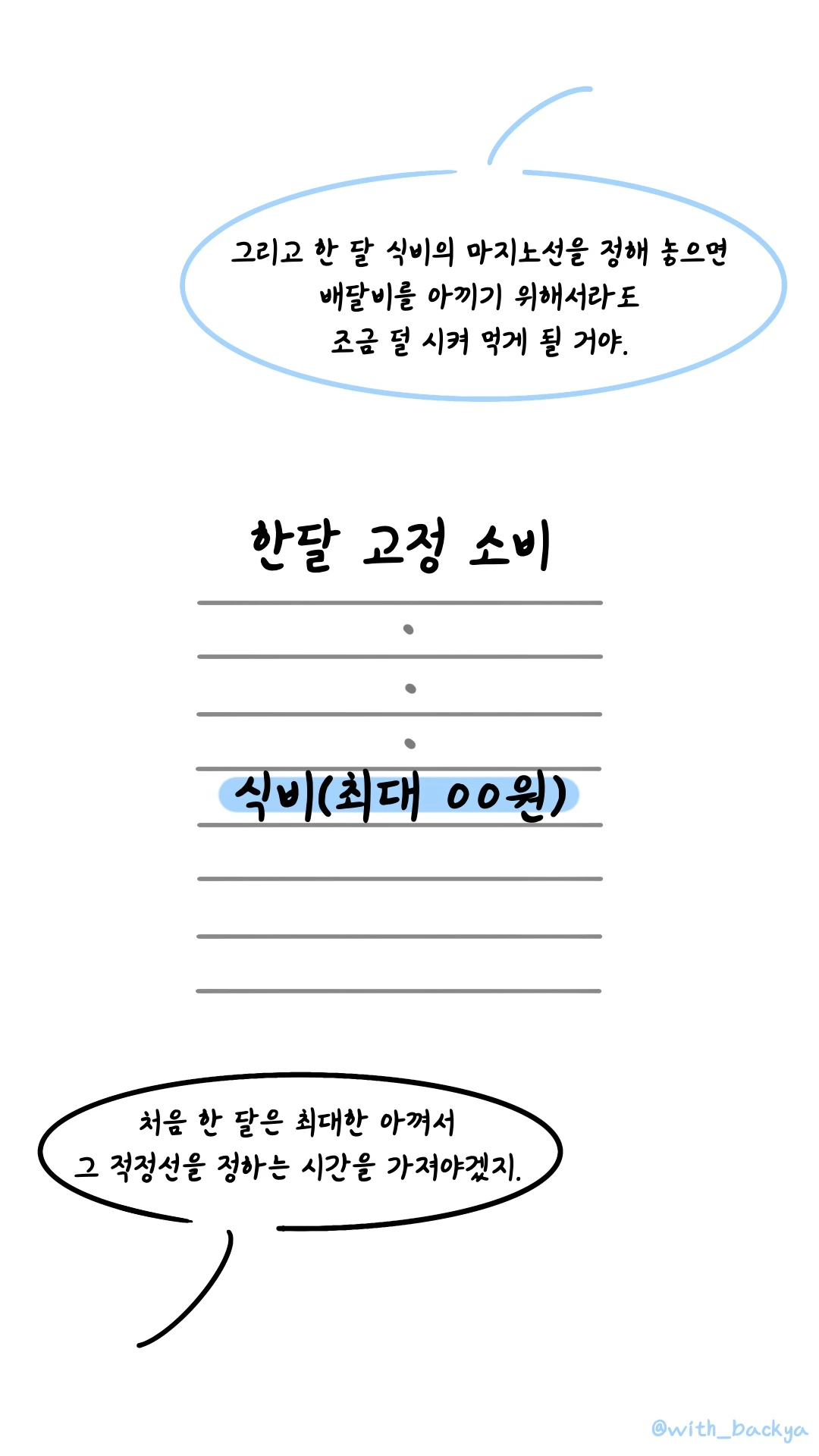 백야_그리고 한 달 식비의 마지노선을 정해 놓으면 배달비를 아끼기 위해서라도 조금 덜 시켜 먹게 될 거야. 처음 한 달은 최대한 아껴서 그 적정선을 정하는 시간을 가져야겠지.
