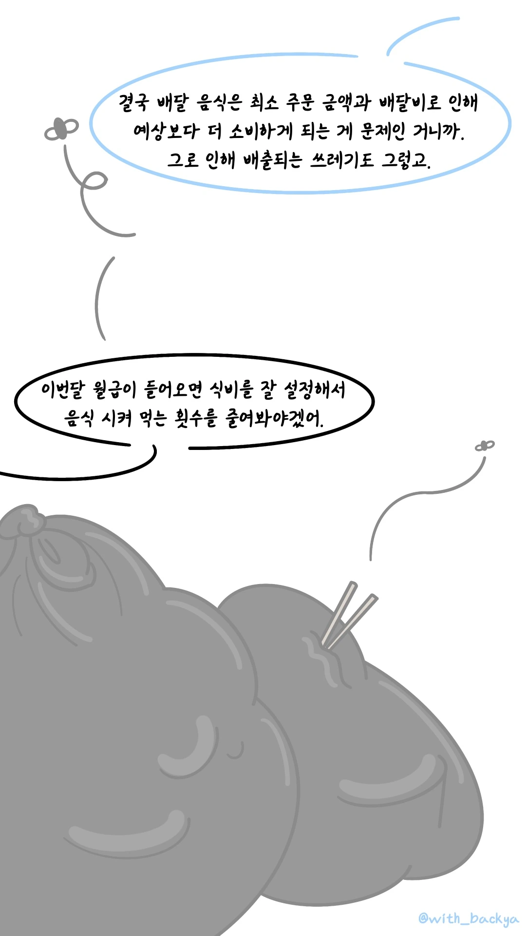 백야_결국 배달 음식은 최소 주문 금액과 배달비로 인해 예상보다 더 소비하게 되는 게 문제인 거니까. 그로 인해 배출되는 쓰레기도 그렇고.