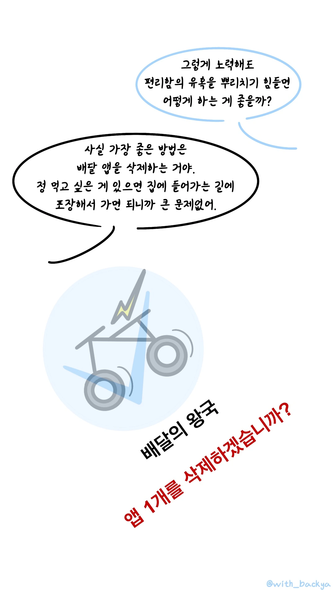 백야_사실 가장 좋은 방법은 배달 앱을 삭제하는 거야. 정 먹고 싶은 게 있으면 집에 들어가는 길에 포장해서 가면 되니까 큰 문제없어.