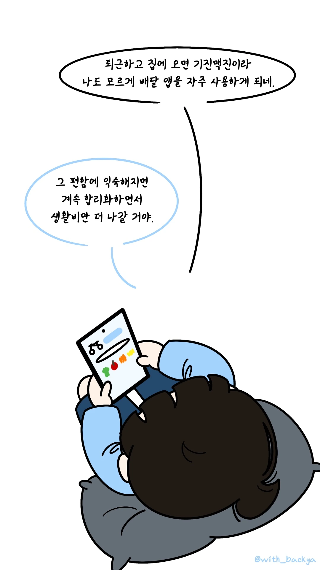 빈아_퇴근하고 집에 오면 기진맥진이라 나도 모르게 배달 앱을 자주 사용하게 되네.