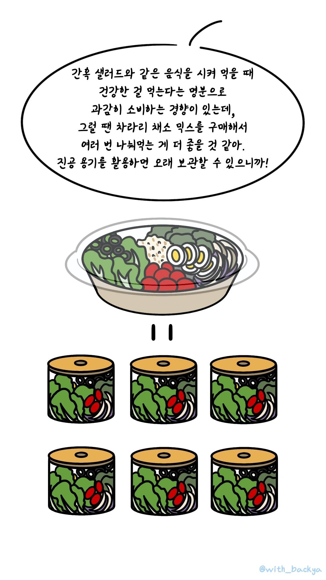 백야_간혹 샐러드와 같은 음식을 시켜 먹을 때 건강한 걸 먹는다는 명분으로 과감히 소비하는 경향이 있는데, 그럴 땐 차라리 채소 믹스를 구매해서 여러 번 나눠먹는 게 더 좋을 것 같아. 진공 용기를 활용하면 오래 보관할 수 있으니까!