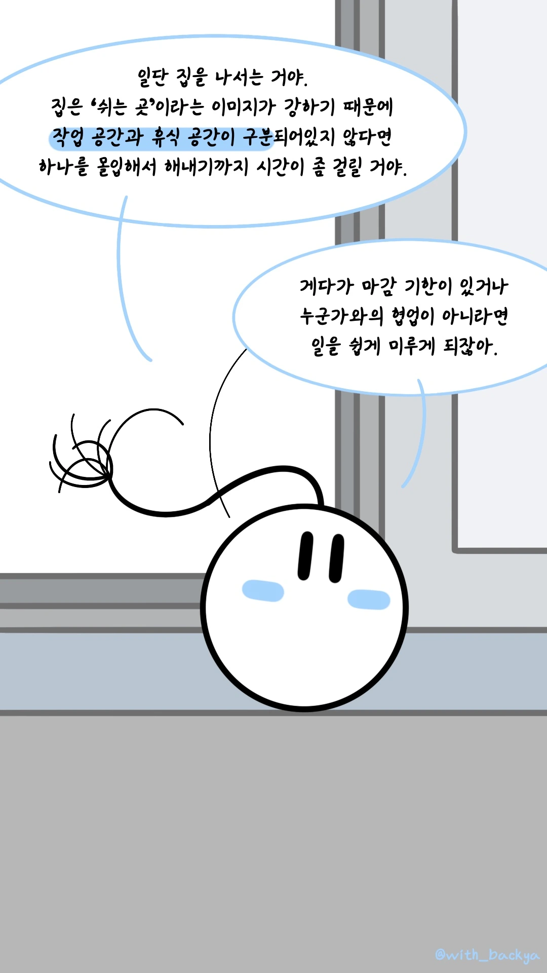 백야_일단 집을 나서는 거야. 집은 '쉬는 곳'이라는 이미지가 강하기 때문에 작업 공간과 휴식 공간이 구분되어있지 않다면 하나를 몰입해서 해내기까지 시간이 좀 걸릴 거야. 게다가 마감 기한이 있거나 누군가와의 협업이 아니라면 일을 쉽게 미루게 되잖아.