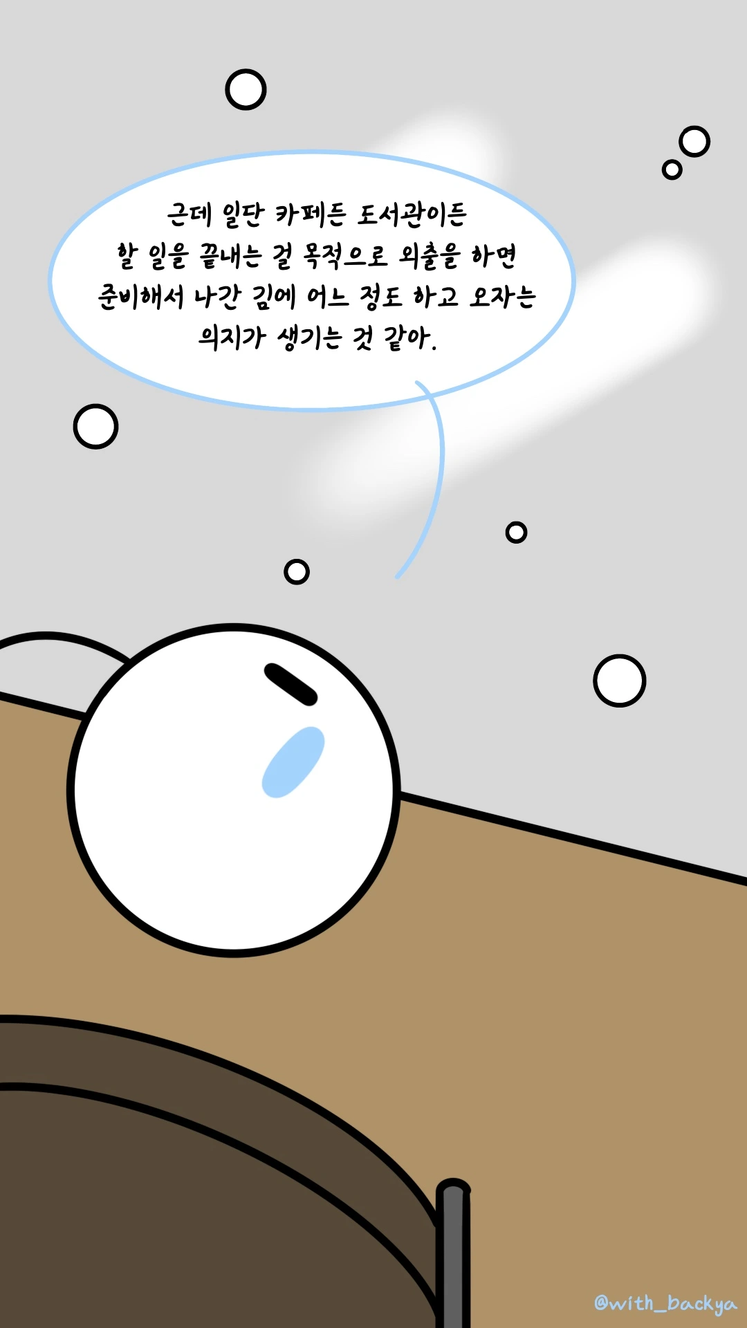 백야_근데 일단 카페든 도서관이든 할 일을 끝내는 걸 목적으로 외출을 하면 준비해서 나간 김에 어느 정도 하고 오자는 의지가 생기는 것 같아.
