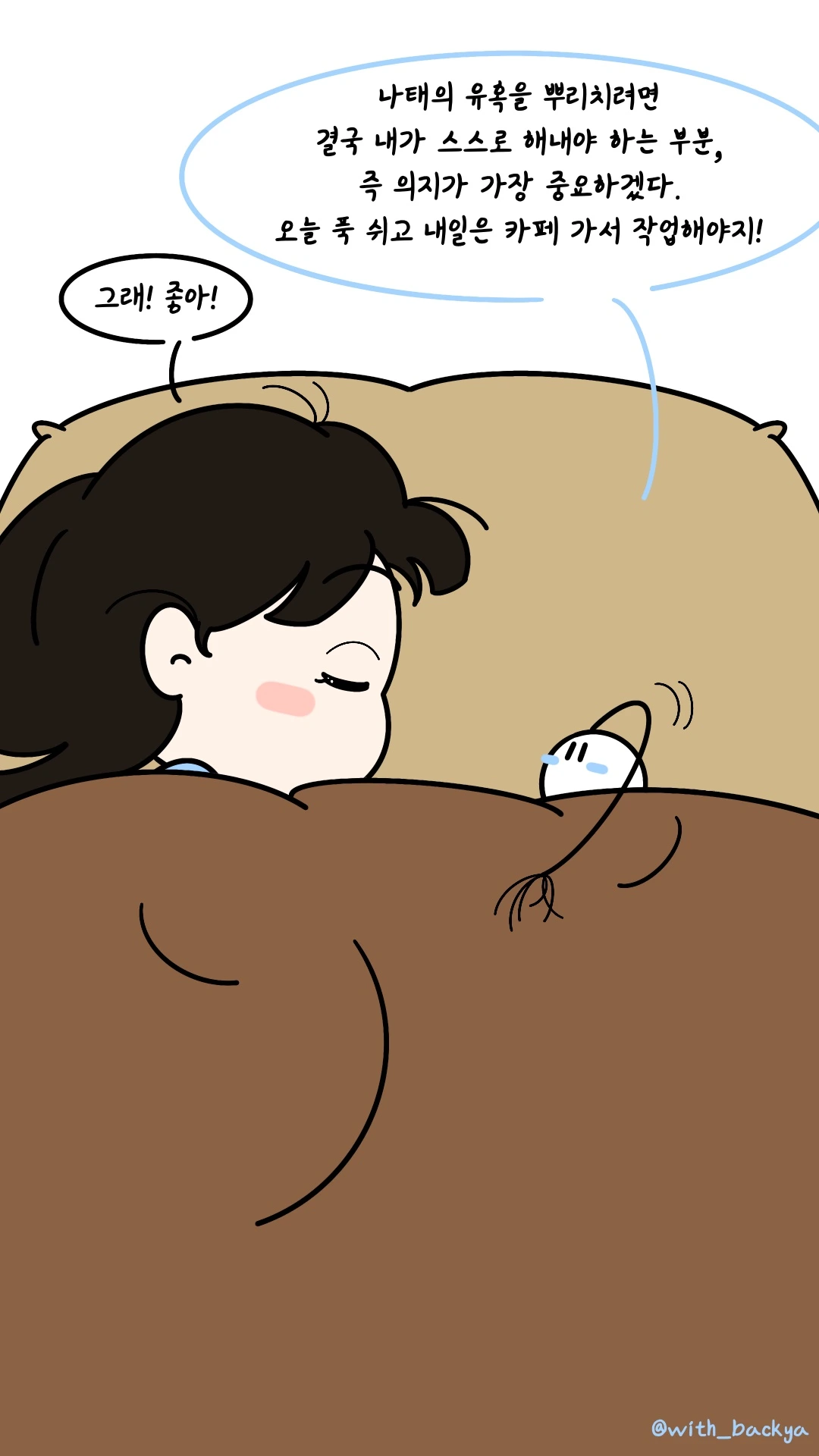 빈아_나태의 유혹을 뿌리치려면 결국 내가 스스로 해내야 하는 부분, 즉 의지가 가장 중요하겠다. 오늘 푹 쉬고 내일은 카페 가서 작업해야지!
