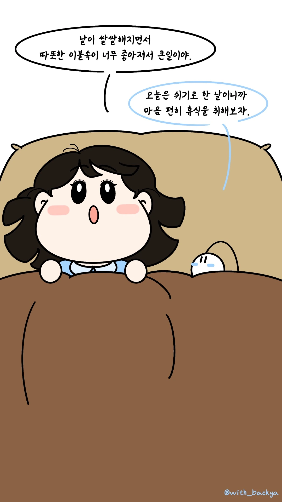 빈아_날이 쌀쌀해지면서 따뜻한 이불속이 너무 좋아져서 큰일이야.