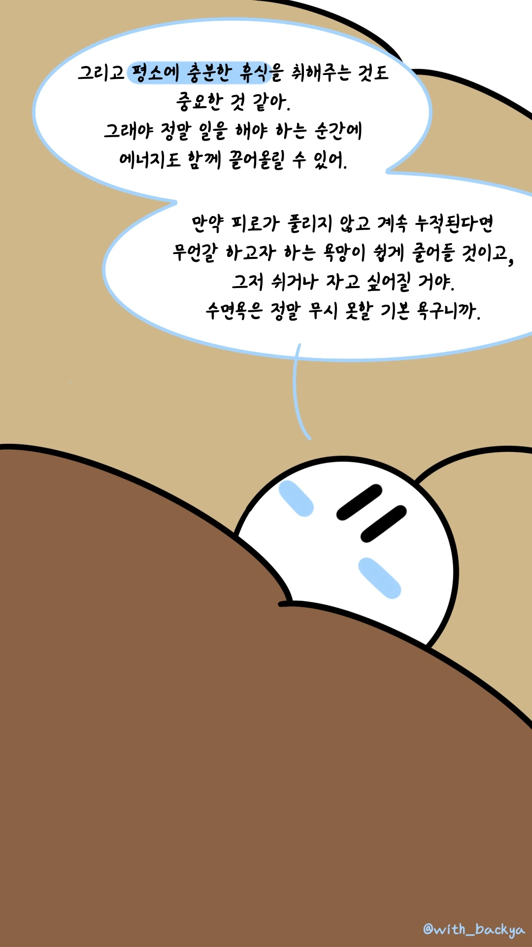 백야_그리고 평소에 충분한 휴식을 취해주는 것도 중요한 것 같아. 그래야 정말 일을 해야 하는 순간에 에너지도 함께 끌어올릴 수 있어. 만약 피로가 풀리지 않고 계속 누적된다면 무언갈 하고자 하는 욕망이 쉽게 줄어들 것이고, 그저 쉬거나 자고 싶어질 거야. 수면욕은 정말 무시 못할 기본 욕구니까.