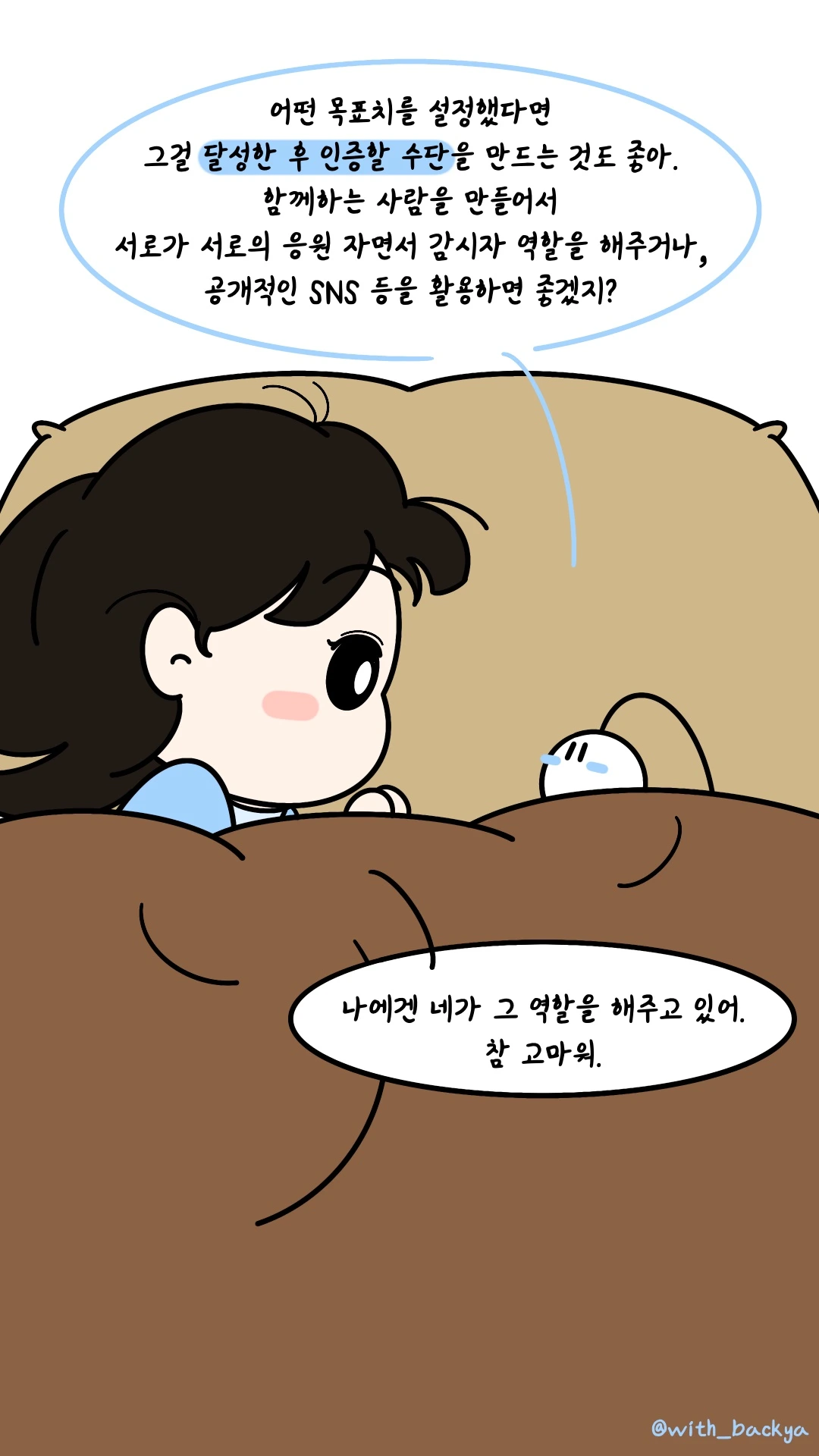 백야_어떤 목표치를 설정했다면 그걸 달성한 후 인증할 수단을 만드는 것도 좋아. 함께하는 사람을 만들어서 서로가 서로의 응원 자면서 감시자 역할을 해주거나, 공개적인 SNS 등을 활용하면 좋겠지?