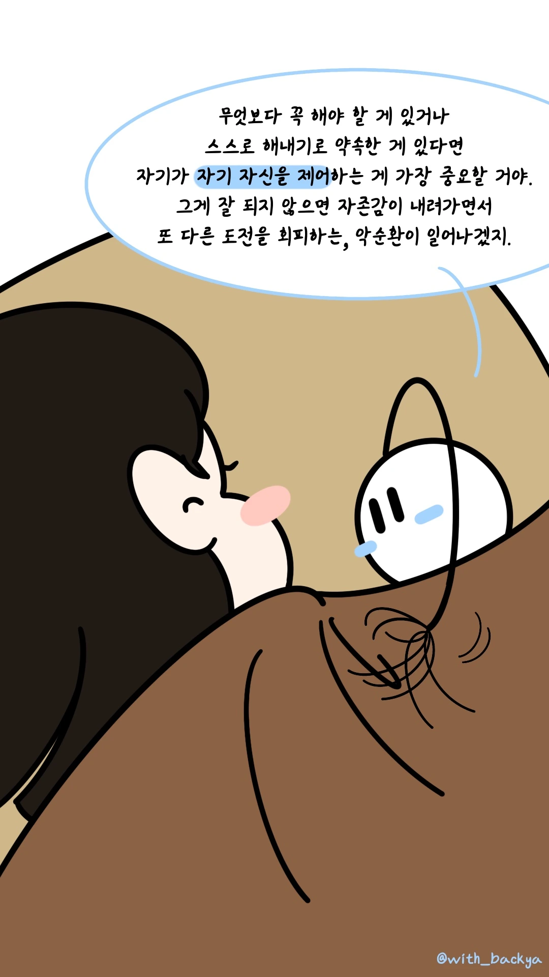 백야_무엇보다 꼭 해야 할 게 있거나 스스로 해내기로 약속한 게 있다면 자기가 자기 자신을 제어하는 게 가장 중요할 거야. 그게 잘 되지 않으면 자존감이 내려가면서 또 다른 도전을 회피하는, 악순환이 일어나겠지.