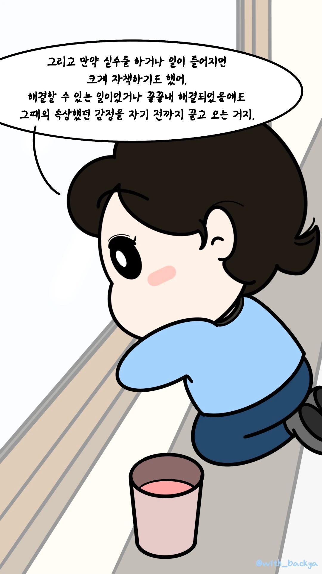 빈아_그리고 만약 실수를 하거나 일이 틀어지면 크게 자책하기도 했어. 해결할 수 있는 일이었거나 끝끝내 해결되었음에도 그때의 속상했던 감정을 자기 전까지 끌고 오는 거지.