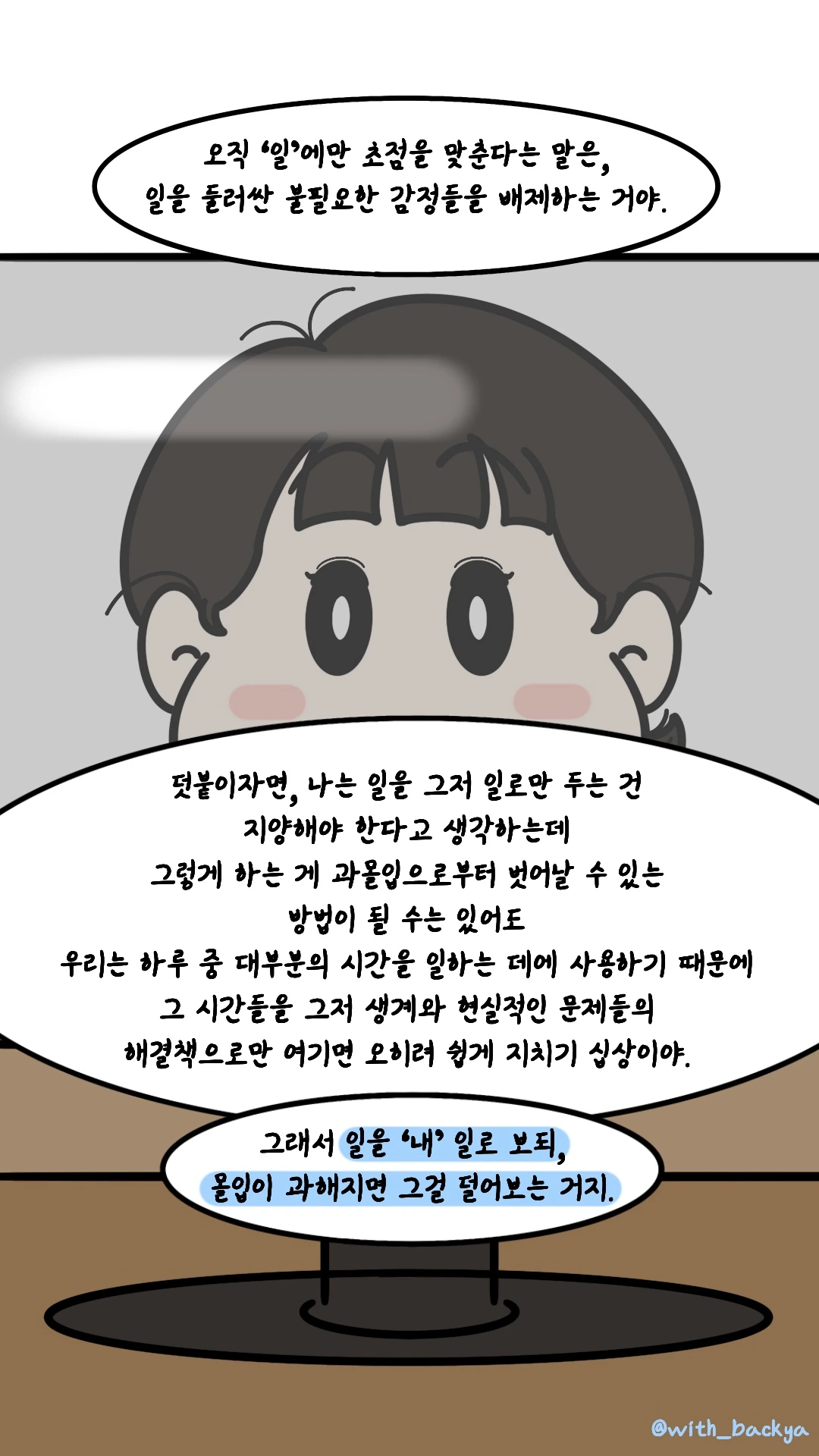 빈아_오직 '일'에만 초점을 맞춘다는 말은, 일을 둘러싼 불필요한 감정들을 배제하는 거야. 덧붙이자면, 나는 일을 그저 일로만 두는 건 지양해야 한다고 생각하는데, 그렇게 하는 게 과몰입으로부터 벗어날 수 있는 방법이 될 수는 있어도 우리는 하루 중 대부분의 시간을 일하는 데에 사용하기 때문에 그 시간들을 그저 생계와 현실적인 문제들의 해결책으로만 여기면 오히려 쉽게 지치기 십상이야. 그래서 일을 '내' 일로 보되, 몰입이 과해지면 그걸 덜어보는 거지.