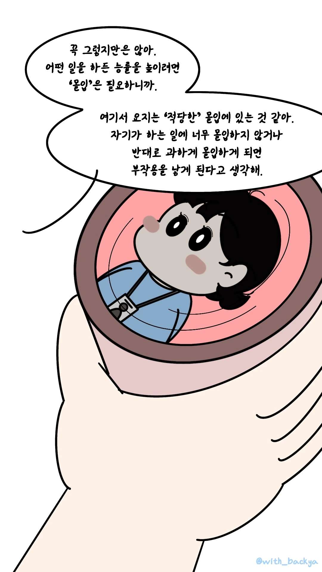 빈아_꼭 그렇지만은 않아. 어떤 일을 하든 능률을 높이려면 '몰입'은 필요하니까. 여기서 요지는 '적당한' 몰입에 있는 것 같아. 자기가 하는 일에 너무 몰입하지 않거나 반대로 과하게 몰입하게 되면 부작용을 낳게 된다고 생각해.