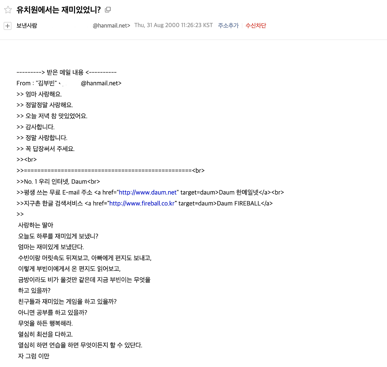 최근 2000년대에 썼던 이메일을 발견했다. 초등학교에 입학할 무렵 처음 이메일 계정을 만들고, 가족들과 종종 메일을 주고받곤 했었다. 한집에 살면서 몇 글자의 말을 그렇게 전달하려 했었다는 게 귀엽고 웃기면서도 어떤 마음으로 메일을 적었는지 전혀 기억이 나지 않아서 남의 편지 읽는 기분으로 쭉 읽어 보았다. 주로 짜증을 내고 혼이 났거나, 동생과 다투었거나, 속상했을 때 주고받았던 메일들이었다. 그때도 지금처럼 나는 어려운 말을 잘 못 꺼내는 사람이었구나 싶었다.
