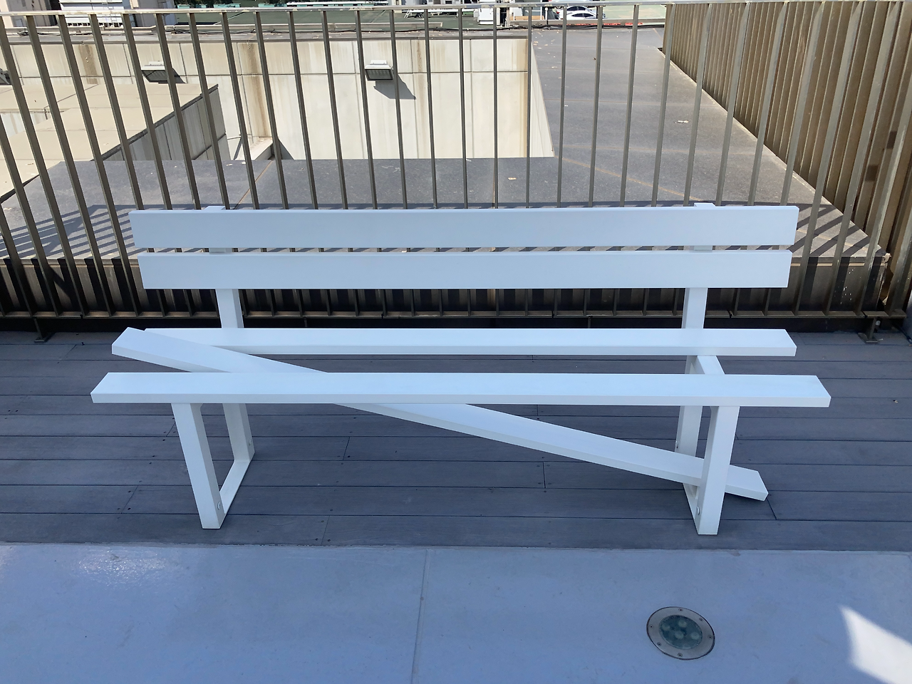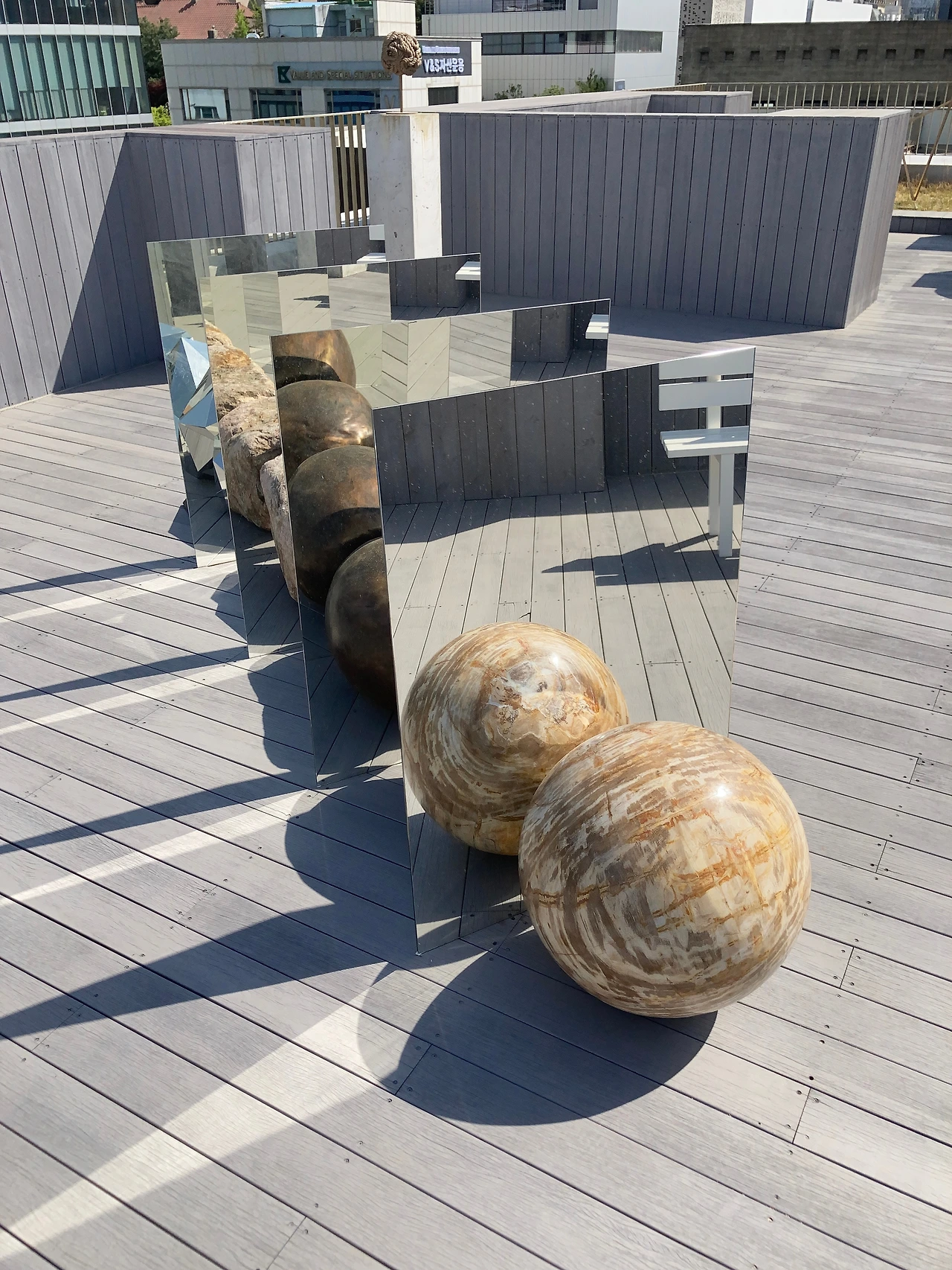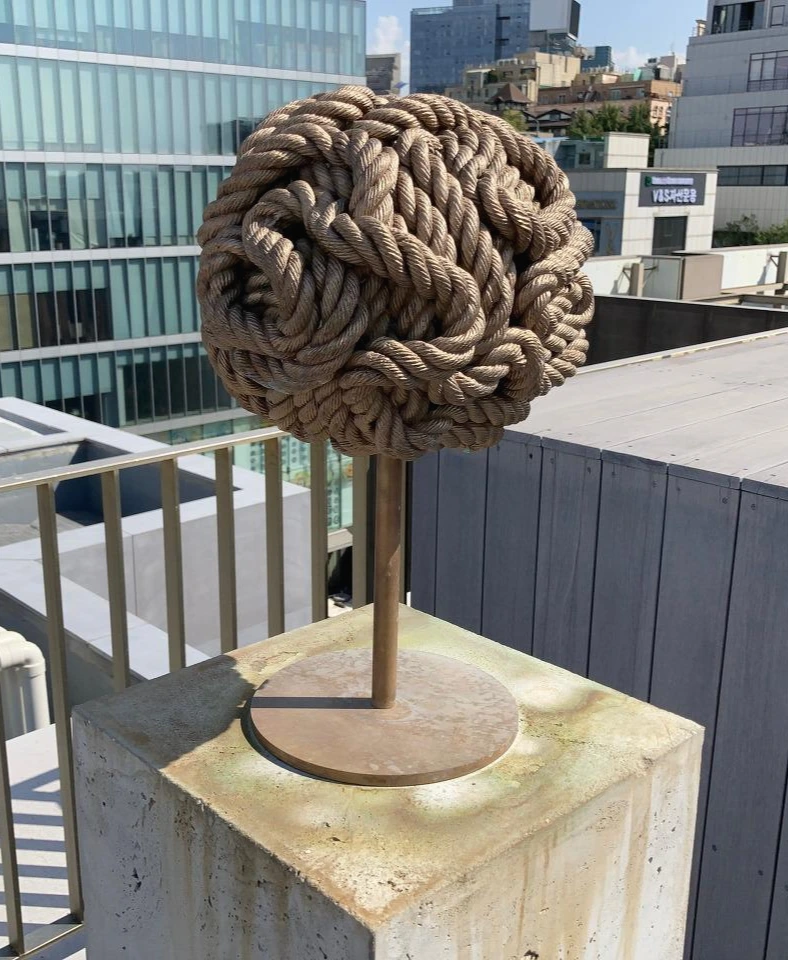 6층은 옥상인데 탁 트인 하늘과 곳곳에 놓여있는 작품들이 잘 어우러져 작은 조각 공원 같은 느낌이 든다. 한 군데씩 비틀어 놓은 벤치, 뇌 형상의 밧줄... 모양의 녹... 이 슨 금, 특이한 조각 등 재미있는 것들이 많다.