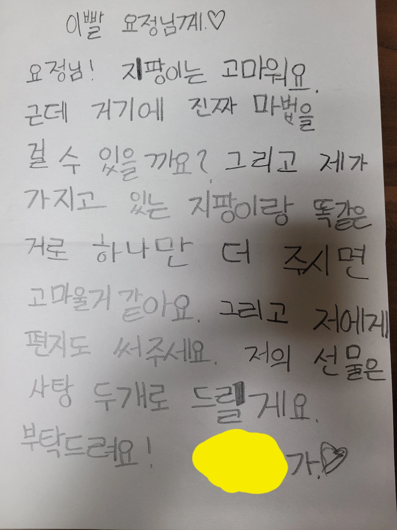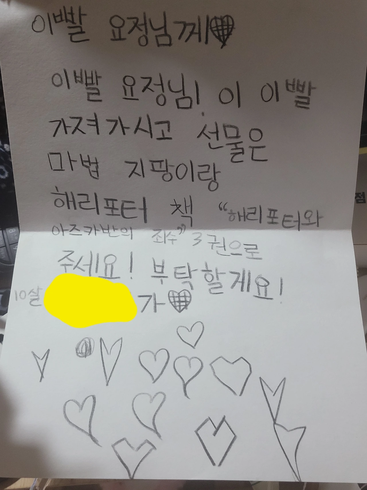 아이는 아무래도 집이 아니라 이빨요정이 고양이를 데려오지 못했을 수도 있다면서 집에 와서 비슷한 편지를 또 쓴다.