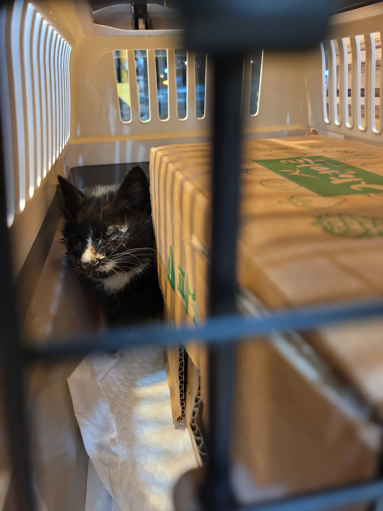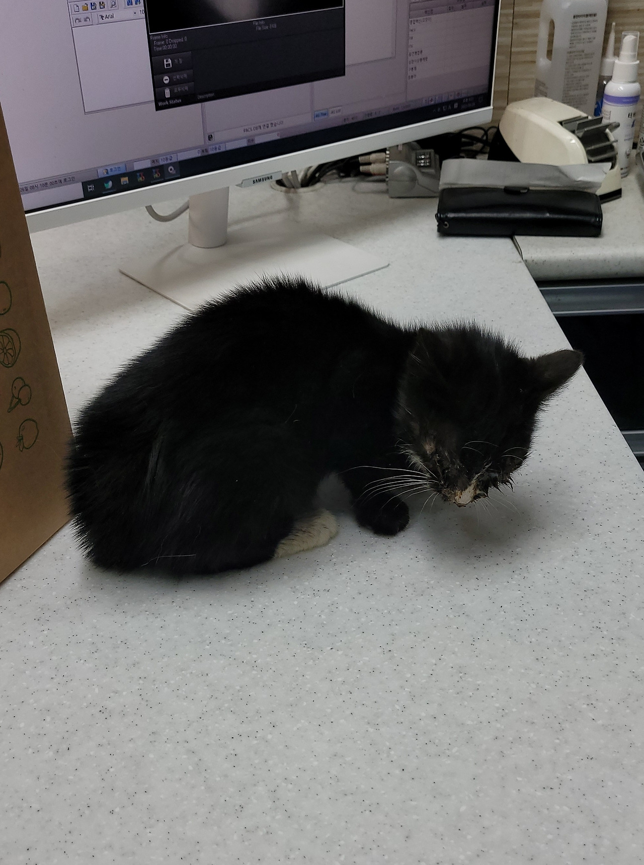 친구 어머니는 마당에 쓰러진 고양이를 도구를 이용해 상자에 넣은 상태였고 저는 그 상자채로 이동장에 넣어 저희 고양이들이 다니는 병원에 갔습니다. 늦은 주말 저녁이라 그런지 진료는 밀려있는데 한 시간 반을 기다리는 동안 고양이는 울지도 않고 거의 움직이지 않을 정도로 컨디션이 나빴습니다.