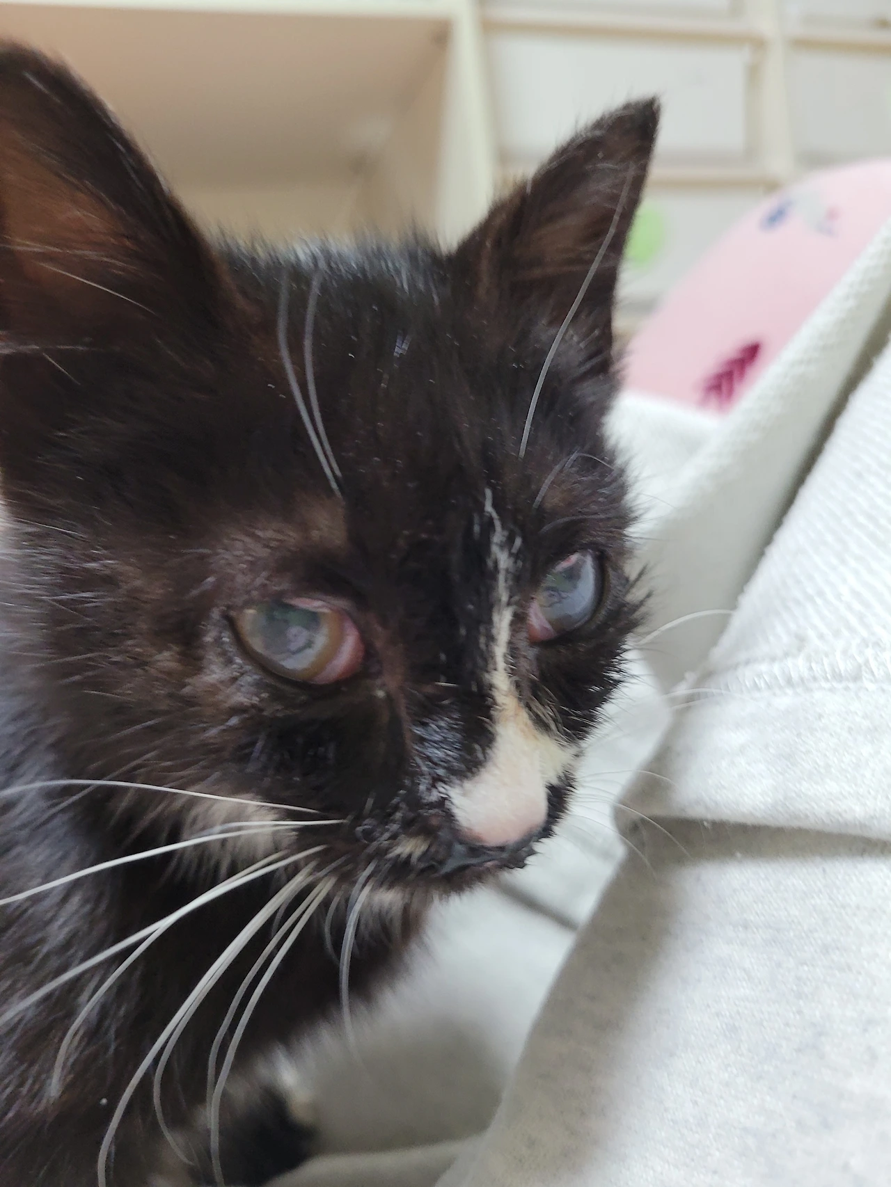 처음에는 소독을 하고 안약을 넣어도 가만히 있길래 순한 냥이라고 생각했지만 며칠이 지나 기력이 돌아오자 주사기로 약을 먹일 때마다 으르렁거리고 발톱을 드러내기도 했습니다.