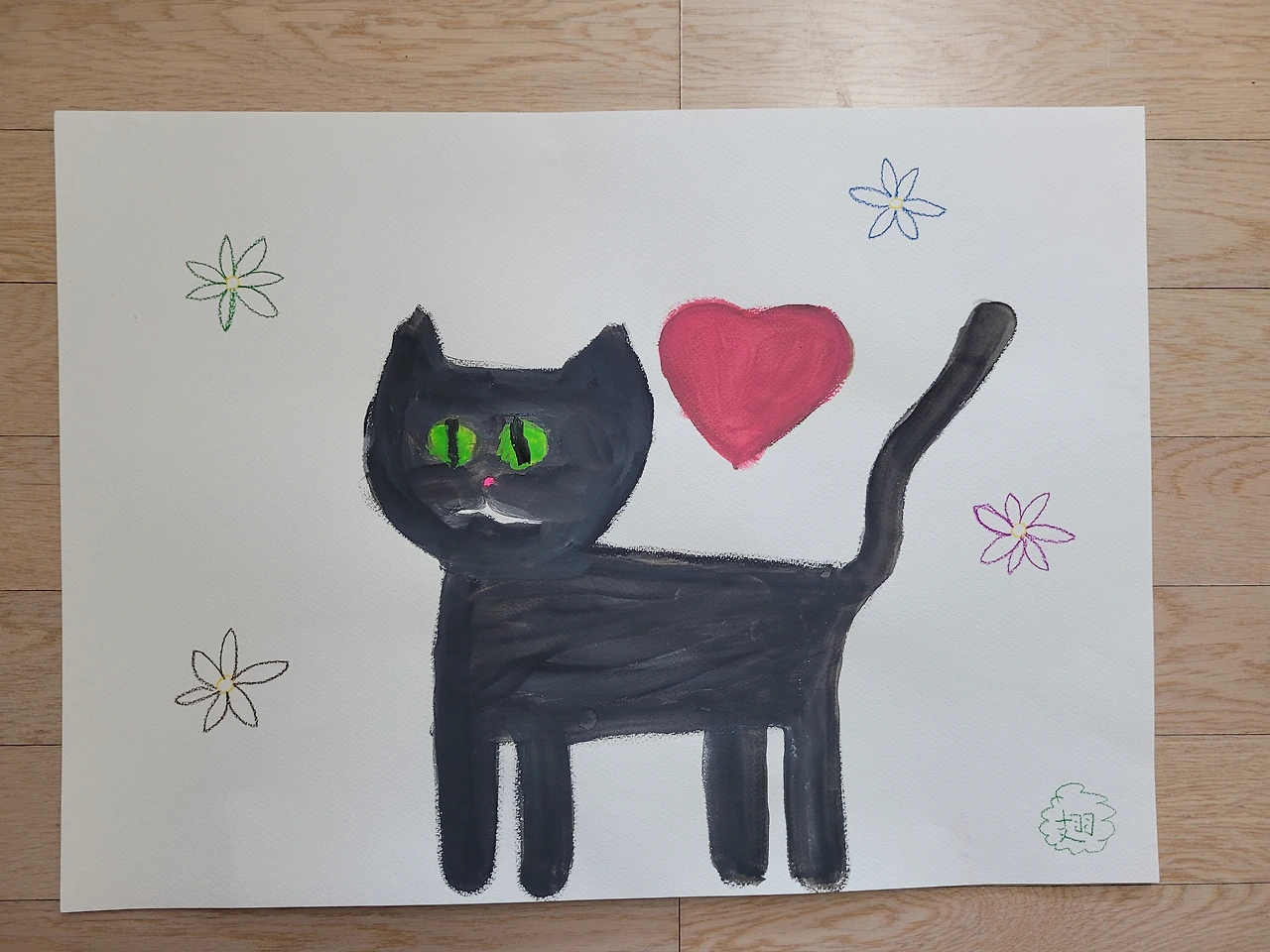 아이 친구 어머니께 연락을 받은 날 낮에 아이가 그린 검은 고양이 그림입니다. 사진으로 받아 본 고양이와 그림 속 고양이가 꽤 닮아 이게 묘연인가 싶기도 했습니다.