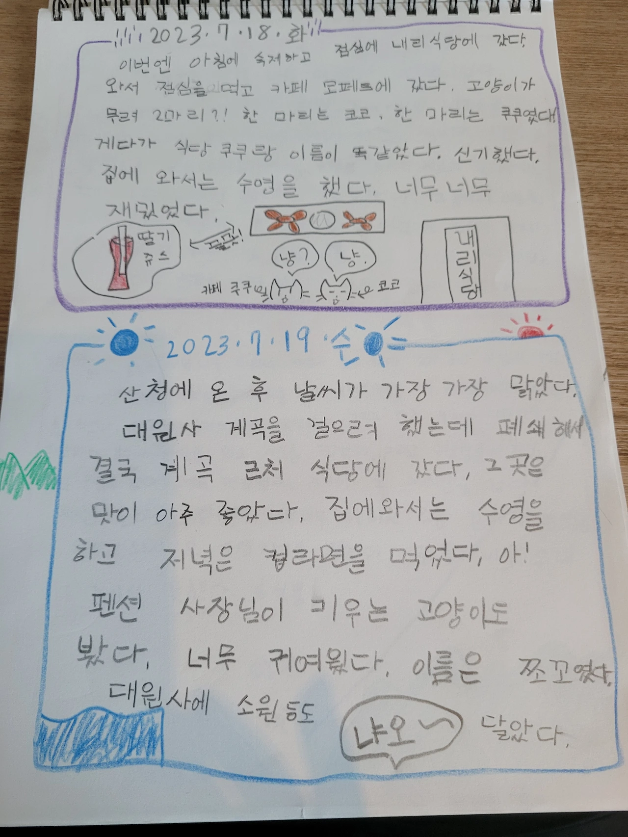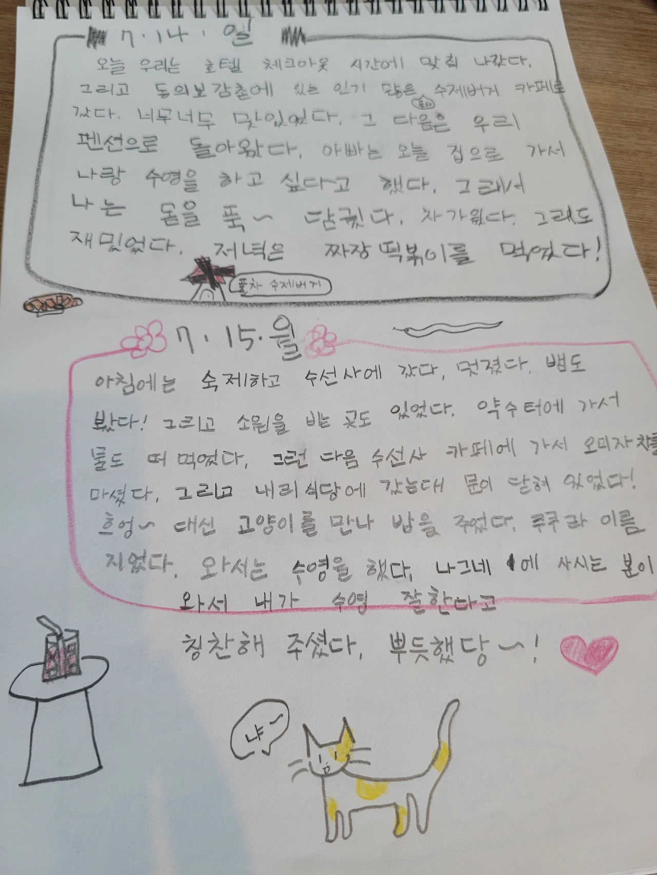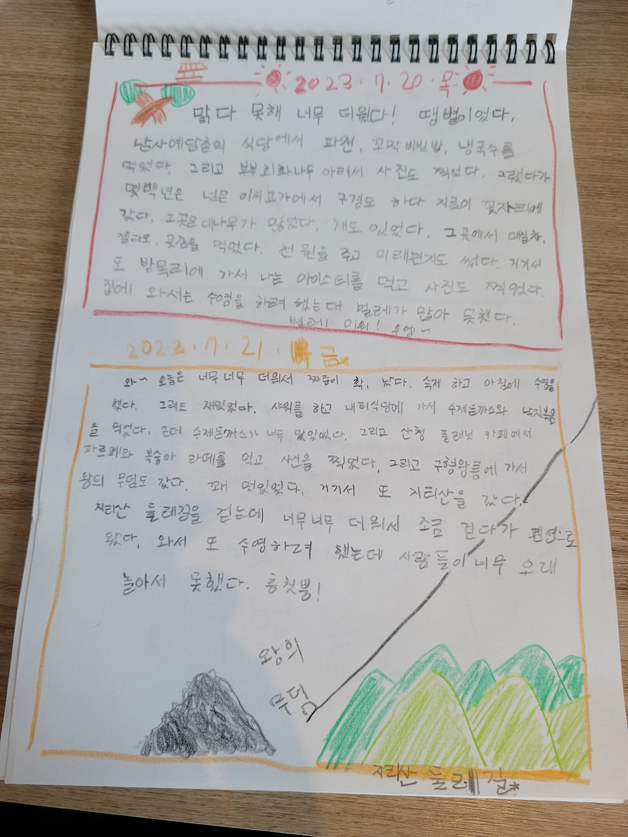 숙제는 잘하고 있는지 따로 확인하지 않지만 일기는 썼으면 싶어서 색연필을 꺼내놓고 함께 별 내용도 없는 일기를 써본다. 그래도 지나고 나면 이 또한 추억이 될 거라 생각하면서.