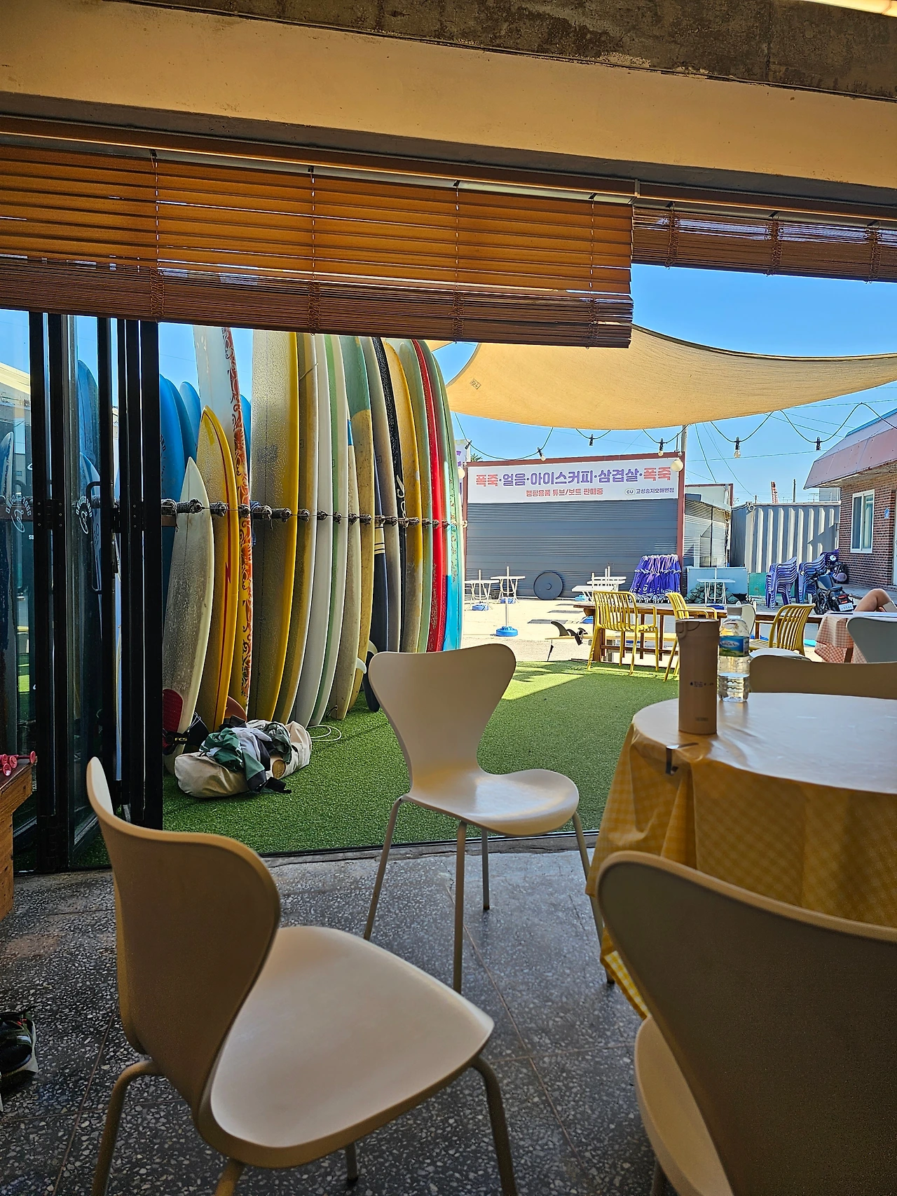 집에 가야 하는 시간과 피로도를 고려해 양양 대신 고성에서 서핑을 했다. 나는 고질적인 어깨 통증과 운전해서 가야 하니 컨디션 조절이 필요할 거 같아 서핑을 하지 않을 생각이었는데 막상 서핑샵에 도착하니 코앞에 파란 바다를 두고 구경만 하기가 아깝게 느껴졌다.