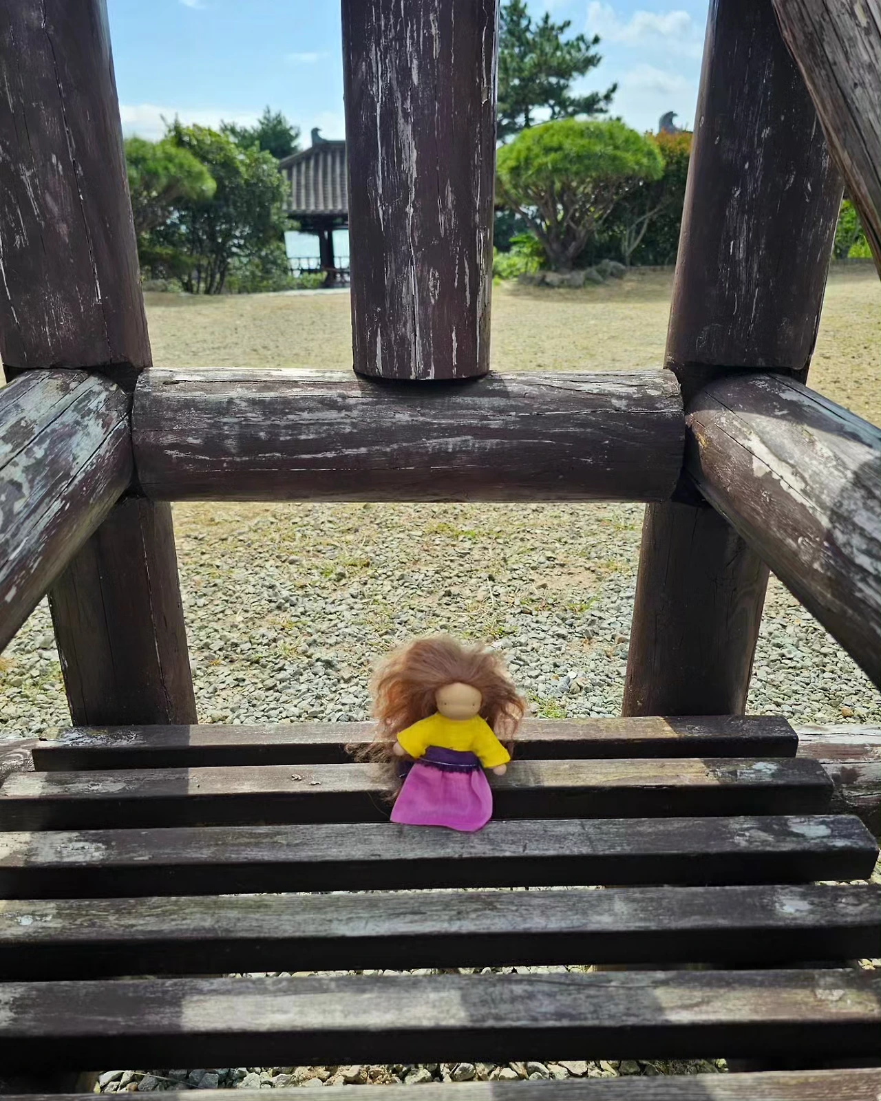 많은 사극 드라마와 영화의 배경이 된 정자에 올라 바닷바람을 느껴본다. 여행메이트 옷을 노랑이로 만들어 입히고 사극 드라마 체험을 시켜본다. 사연 많은 조선시대 여인이 되어 모질게 고신을 당하는 그런 스토리로...