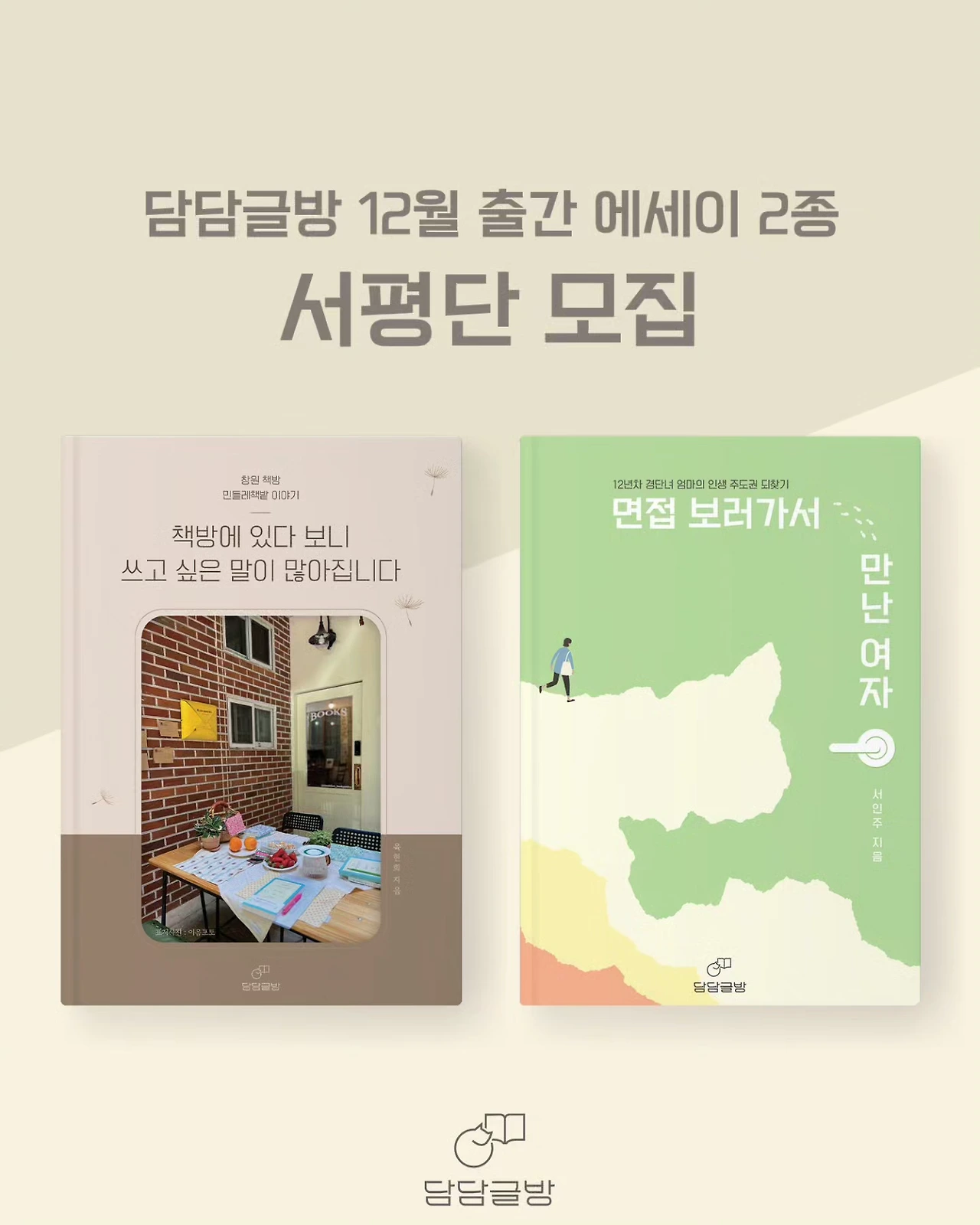 담담글방 글벗들을 찾는 이유는 출간한 책들의 서평을 포함해 앞으로도 담담글방과 꾸준히 인연을 이어갈 분들을 만나 뵙고 싶기 때문인데요.