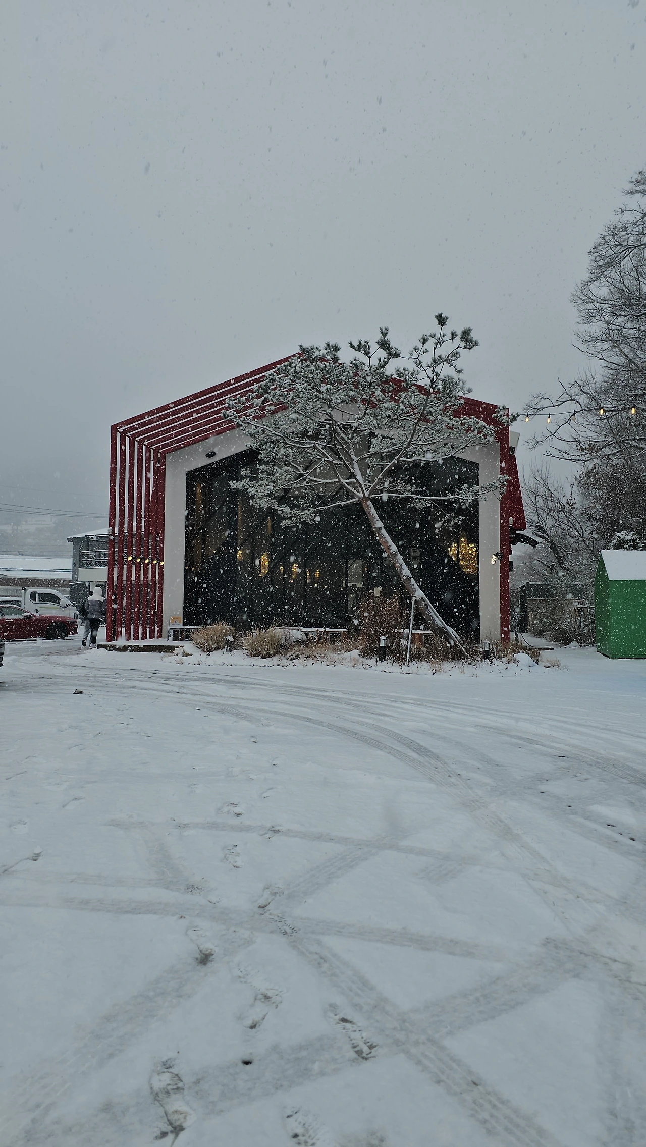 눈 내리는 창가가 내 차지다. 2면이 통창으로 되어있어 눈 오는 풍경을 아쉽지 않게 누렸다.