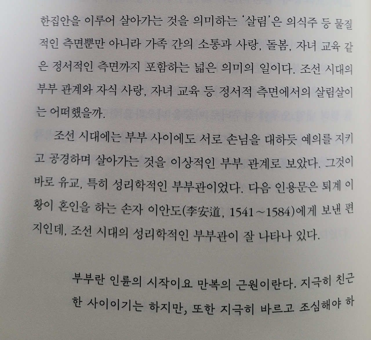 조선시대에는 부부 사이에도 서로손님을 대하듯 예의를 지키고 공경하며 살아가는 것을 이상적인 부부관계로 보았다. 그것이 바로 유교, 성리학적인 부부관이었다.