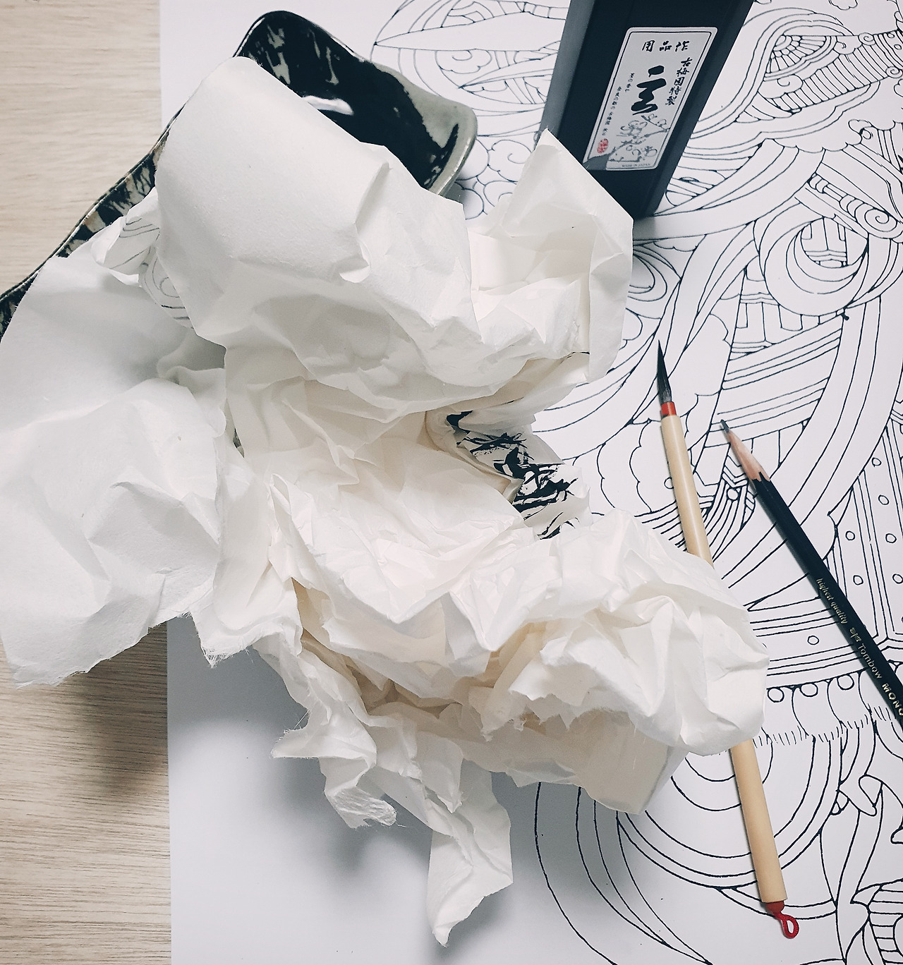 오늘따라 습화 하는데 어쩐지 붓이 대박 잘 나간다 했다. 좋은 붓이 있는데 좀 컨트롤하기 어려워서 안 쓰고 있다가 오랜만에 선 그었더니 미끄러지듯이 잘 나가기에 내가 드디어 단계를 뛰어넘었구나 혼자 신났다. 그러나 가장 기본 중의 기본인 밑그림초를 움직이지 않게 고정하는 걸 깜빡해서 초가 계속 조금씩 어긋나고 있었다는 걸 몰랐다.