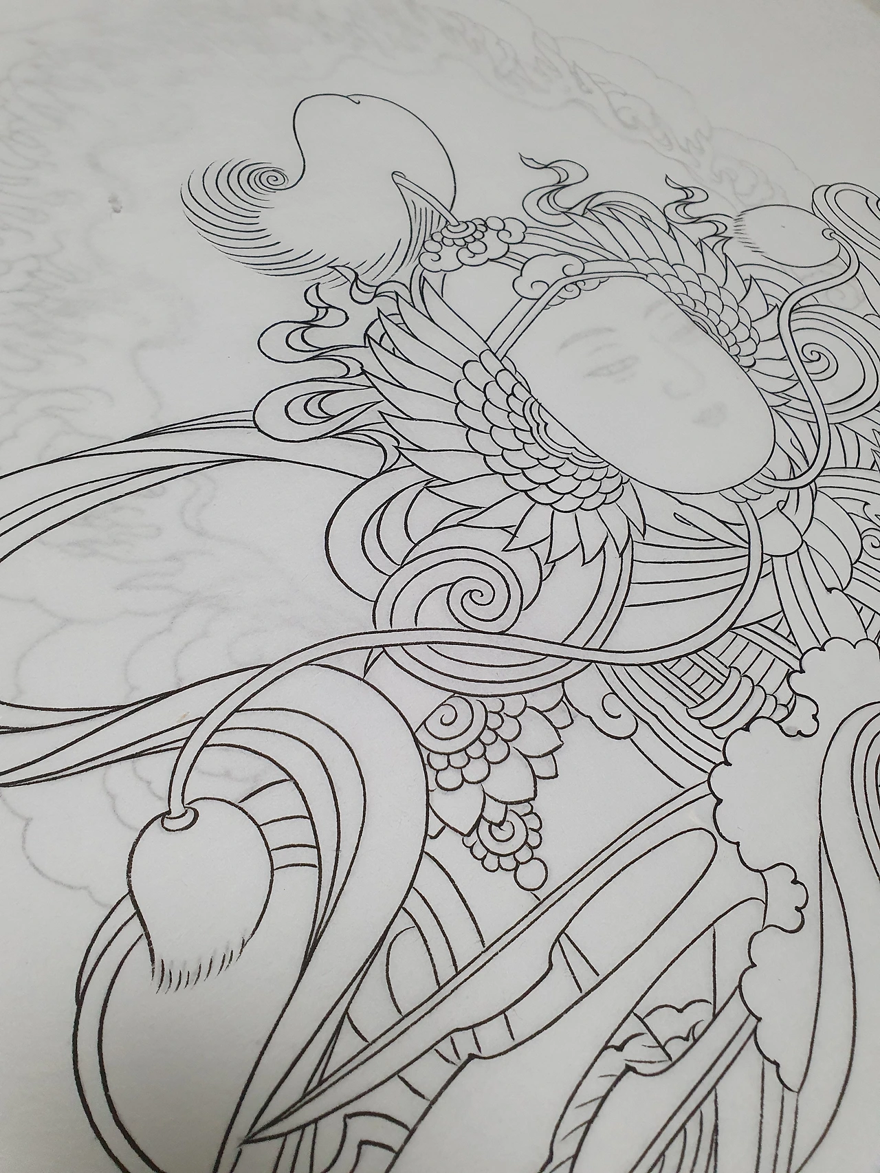 선생님이 신중은 강력한 힘으로 불법(佛法)을 수호하기에 상호(얼굴)도 다소 무섭고 엄해도 상관없댔다. 예전에는 동진보살이 어쩐지 그리기가 힘에 부치고 붓이 잘 나가지가 않아 고운 불보살만 주로 했는데 나이 먹고 살찌고 벌크업 해서 그런지 이제 신중인 위태천 동진보살도 씩씩하게 그려진다. 맷집으로 승부한다.