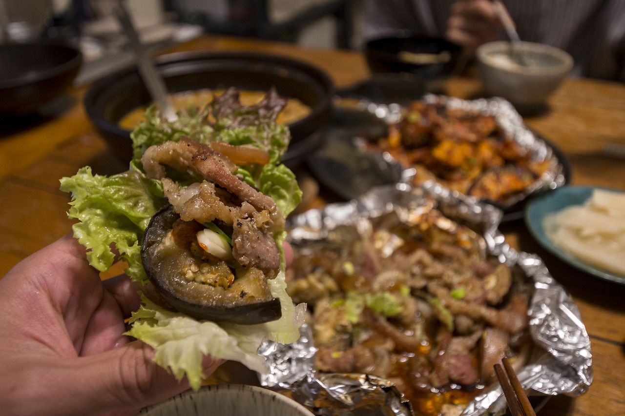 마찬가지로 청국장과 함께 직접 양지 덩어리에서 썰어낸 차돌박이 로스구이.