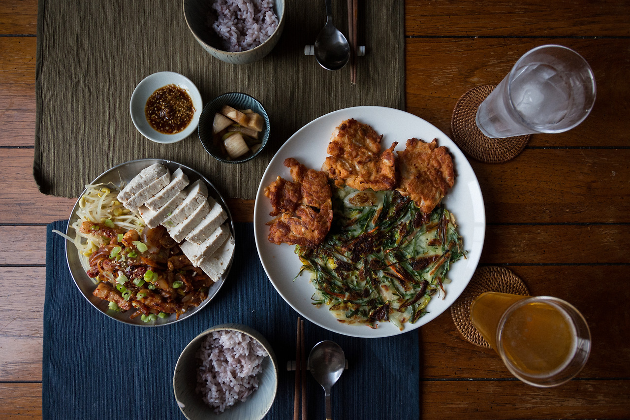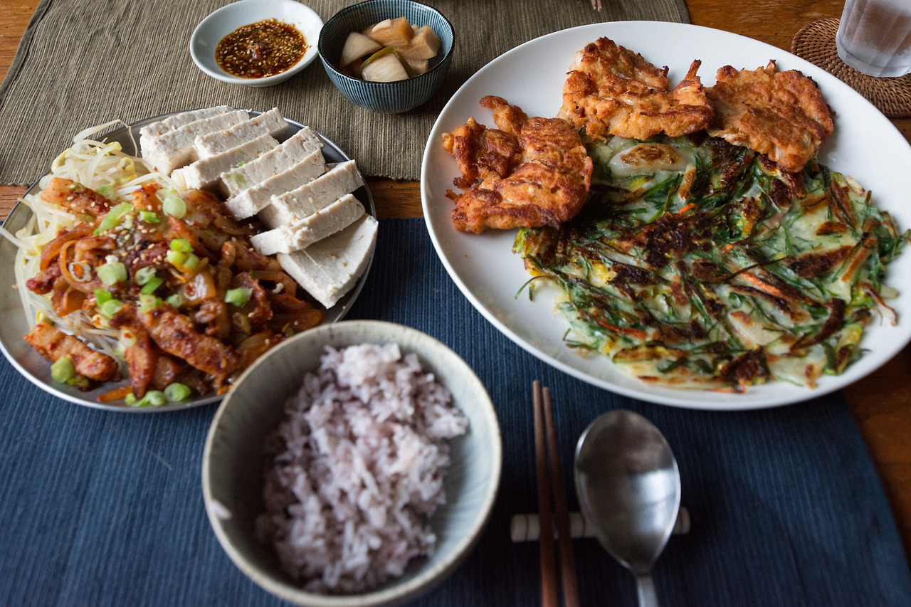 어떤 흐린 날, 김치전, 부추전, 제육볶음, 콩나물무침, 그리고 두부. 양파 장아찌는 덤.