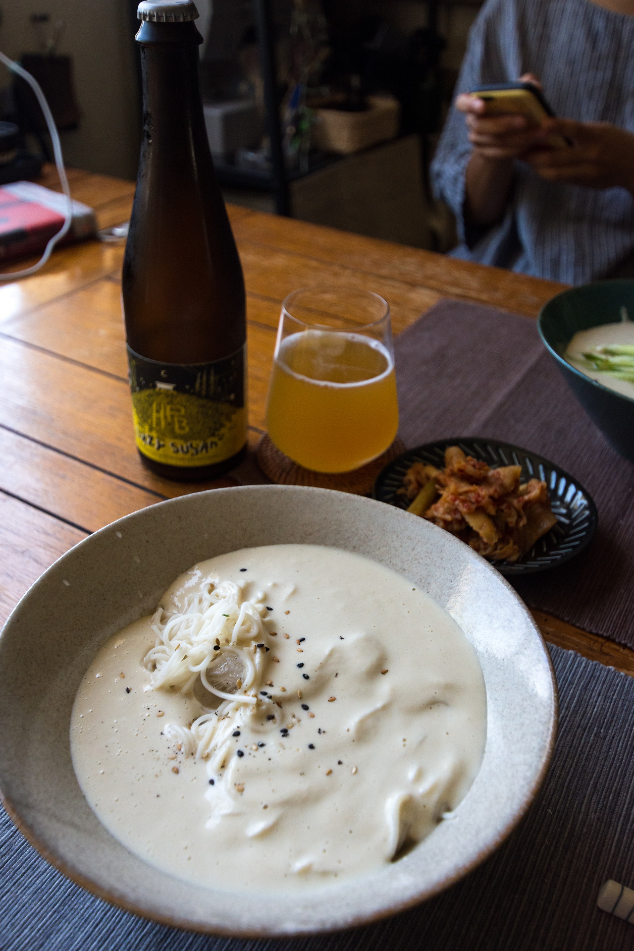 아내의 친구들과 함께 이 전날 저녁을 먹고 남은 불족발을 포장해와서 콩국수와 함께하였다. 그리고 얼얼할 정도로 새콤한 키위 사워 맥주를 페어링 하기로 하였다. 부드러운 콩국수에 상큼한 맥주가 어찌나 잘 어울리던지, 이 때 부터 우리에겐 '콩국수엔 사워지!'라는 공식이 생겼다. 이것은 누구에게도 추천할 만한 마리아주이다.