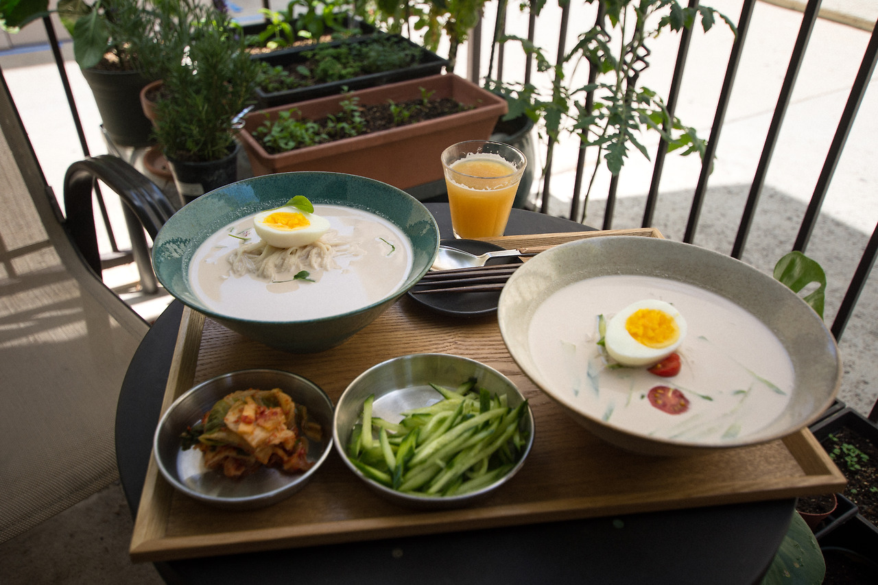 그 다음날 햇살 좋은 휴일, 고상스러운 브런치로 콩국수를 먹기로 했다. 너무 멋지고 따스한 햇살과 바람을 만끽하며, 발코니에 나가 앉아, 김치, 오이, 그리고 맥주 한 캔을 준비하였다. 그리고 대망의 콩국수.