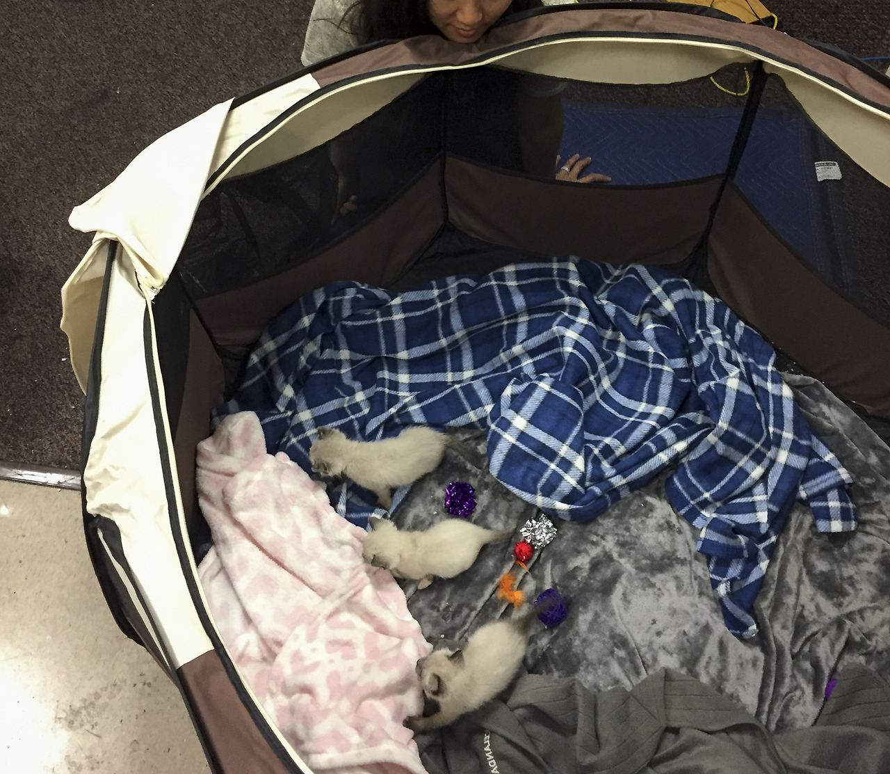 세트장에 도착하자 에어컨이 아주 빵빵하게 틀어져 있어 조금 걱정이 되었으나, 촬영을 조율하는 보호소 측 담당자가 녀석들이 따뜻하게 있을 수 있도록 보온 패드, 그리고 많은 담요들을 준비해 주었다. 이 기획에 관계된 스태프들도 이 녀석들을 보고 신이 났다. 다들 손을 한 번씩 씻은 후 돌아가면서 쓰다듬어보고, 안아보고, 사진을 찍고, 한참을 구경을 했다. 아직 낯을 가리지 않아서인지, 그저 이 녀석들이 넉살이 좋은 것인지, 완전히 새로운 환경에서 낯선 인간들에게 둘러싸여 있음에도 신나게 뽈뽈거리고 돌아다녔다. 우리도 이 모습이 너무 신기하고 귀여워서 한참 바라보고만 있었다.