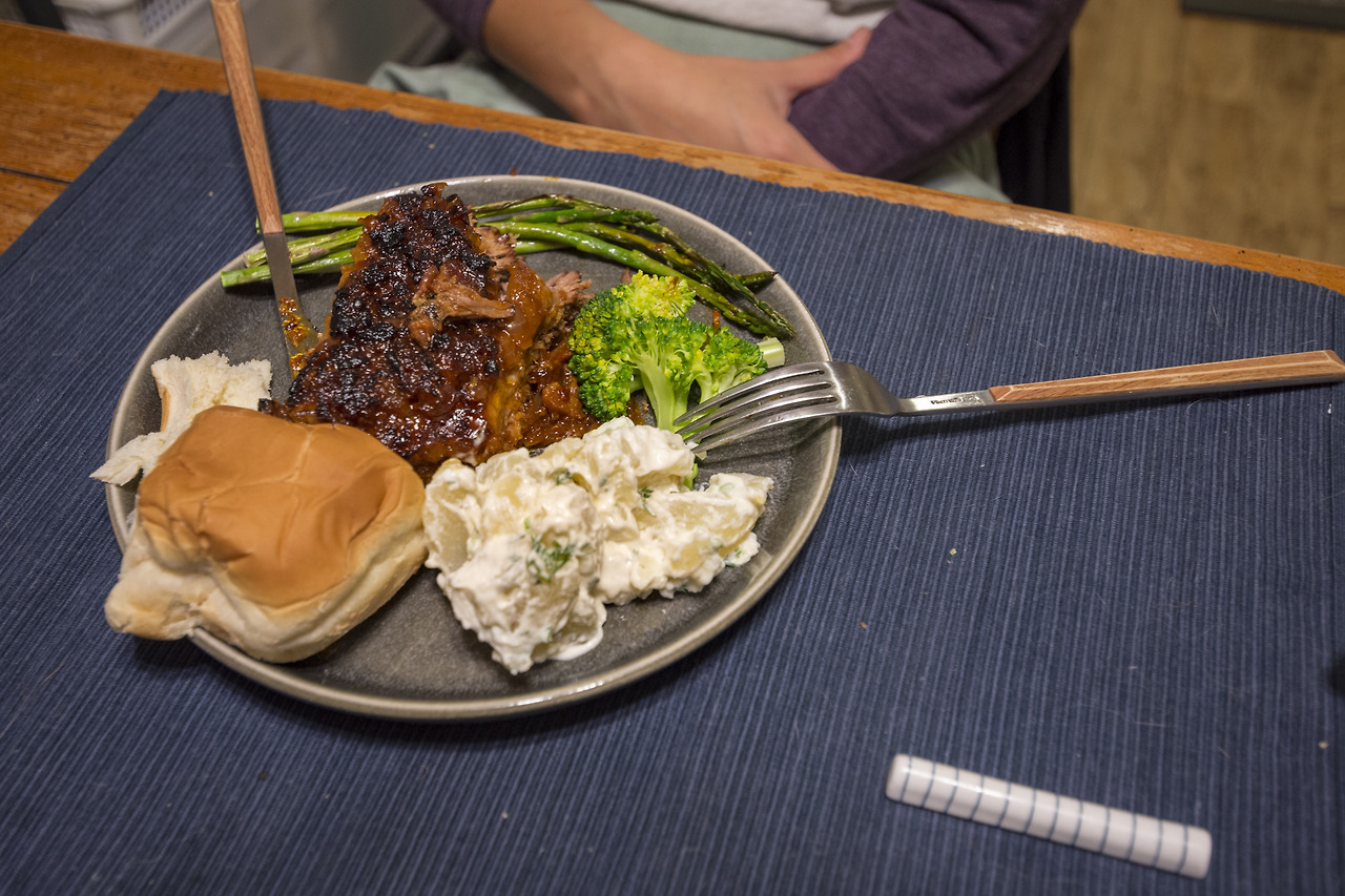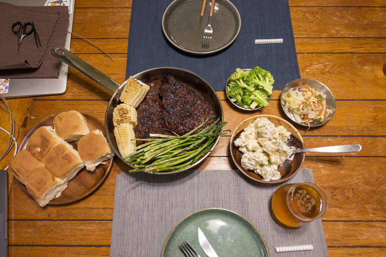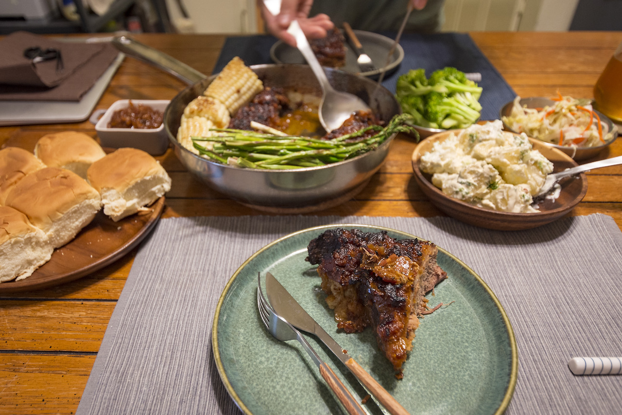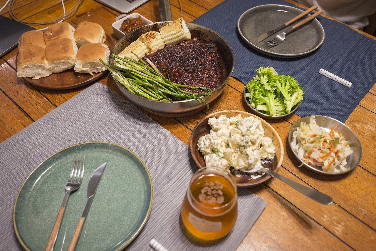 그 첫번째, 바베큐. 상큼하고 달달한 그녀의 특제 소스를 올린, 몇 시간을 오븐에 구워낸 바베큐. 아내가 직접 담근 사워크라우트. 그리고 감자 샐러드, 폭신한 디너롤. 어째서인지 텍사스 본토에서 온 것 같은 저녁이었다.
