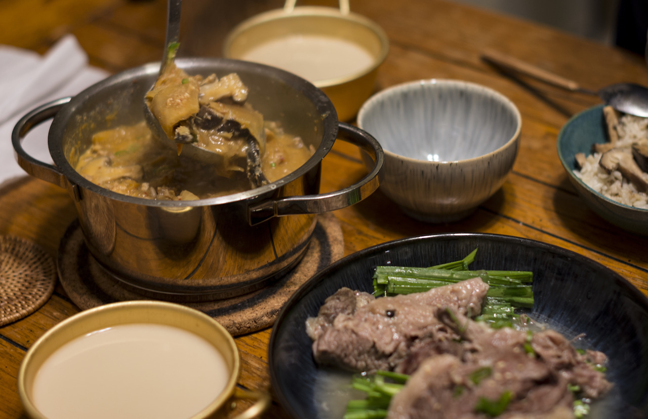 직접 담근 막걸리, 무, 표고 솥밥, 부추 소수육. 아주 자랑스런 한식의 한 상이다.
