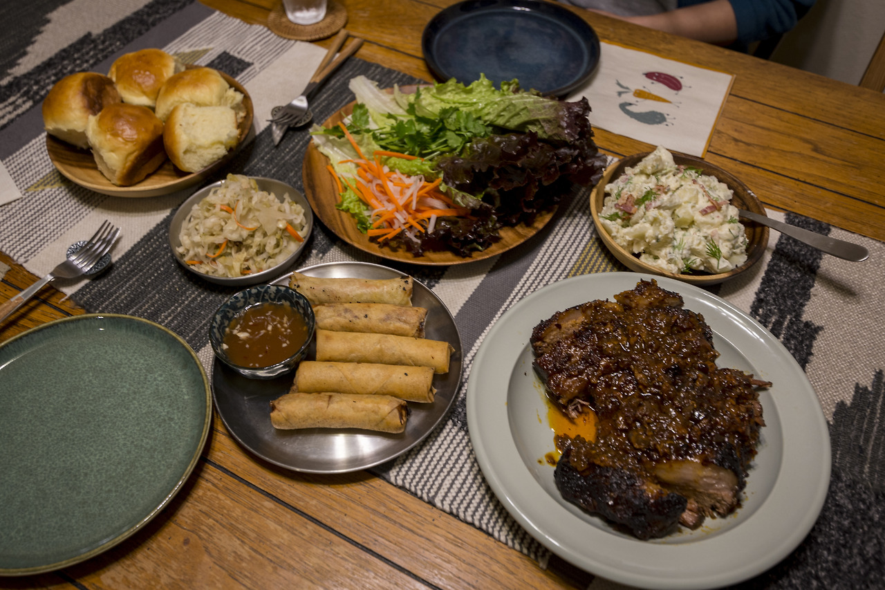 그 다음 날은 다시 바베큐. 친구가 놀러오면서 가져다 준 춘권도 같이 먹고, 딜 (Dill)의 포함으로 업그레이드 된 감자 샐러드와, 저번 먹었던 디너 롤이 너무 달아서 직접 구워버린 특제 디너 롤, 그리고 더 조합이 좋아진 바베큐 소스로 성대한 만찬을 함께하였다.