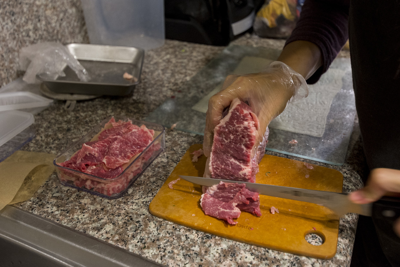 기름을 많이 걷어 내고, 차돌박이 부분을 분리하여 로스를 하기 위해 필렛용 칼로 썰기 시작했다. 차돌박이가 양지와 붙어 있다는 사실을 이 즈음까지 전혀 몰랐고, 썰어 내면서야 실감이 났다. 얇게 썰어진 차돌박이. 얼마나 이 칼이 예리한지 잘 느껴진다.