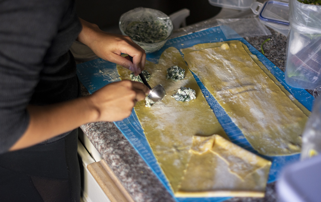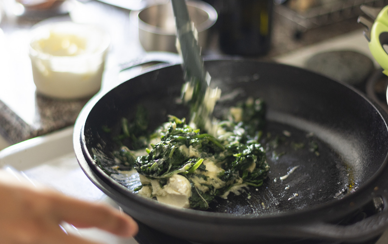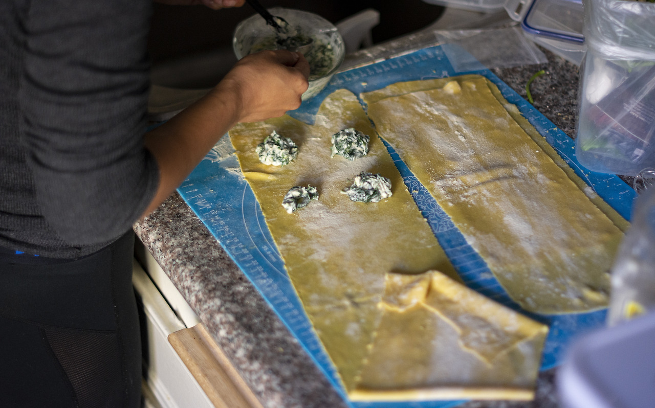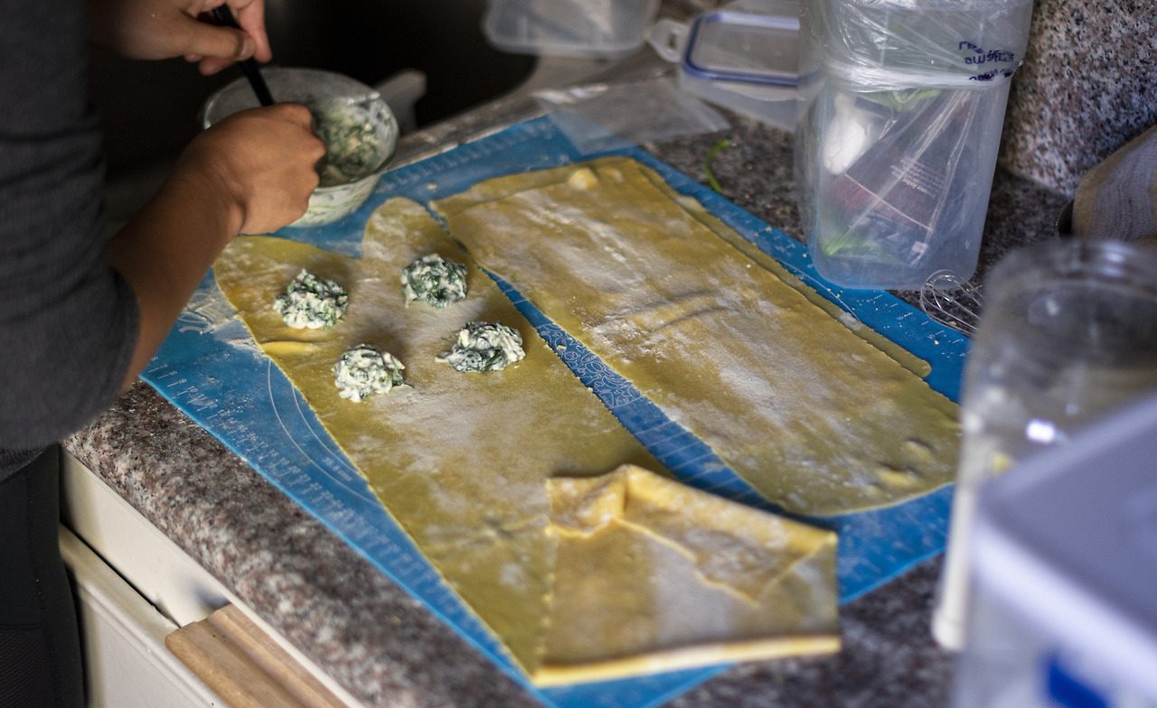 나는 면을 다 만들었으니 아내가 마법의 요리를 시작한다. 집에서 그가 직접 만든 리코타 치즈와 시금치를 섞는다.
