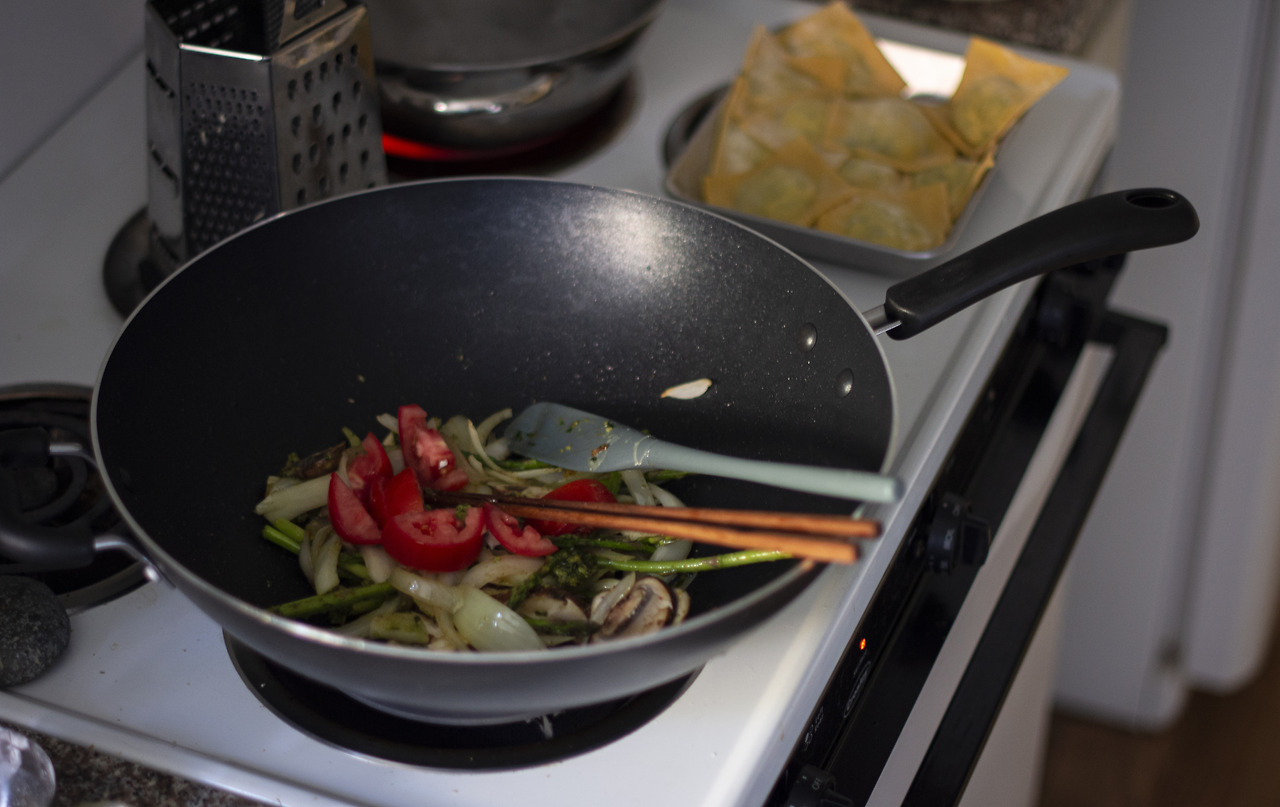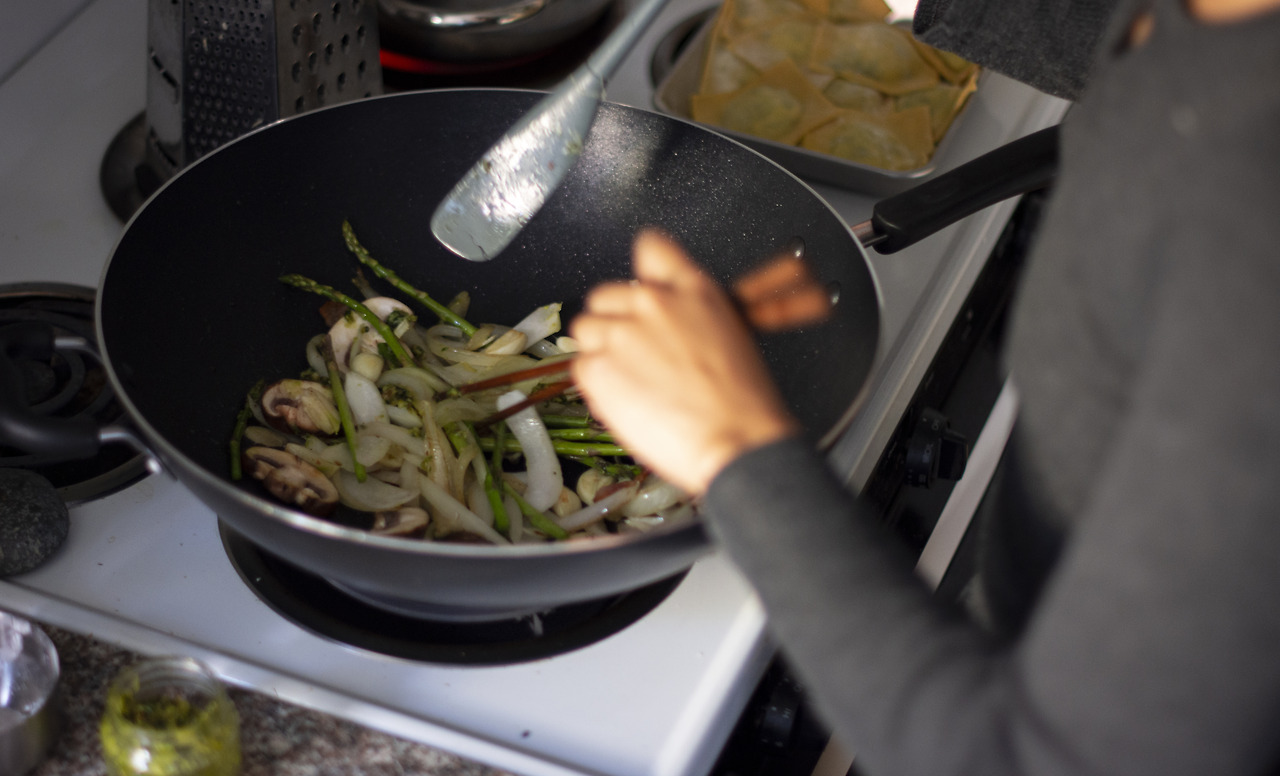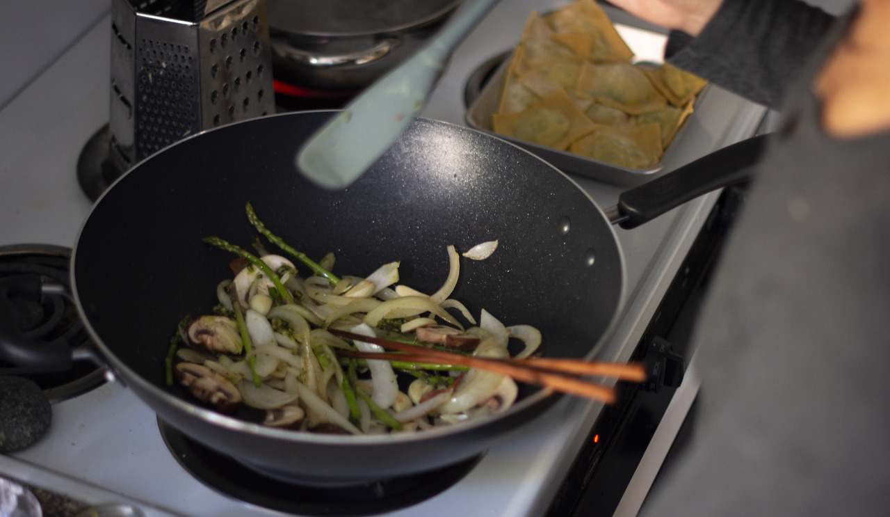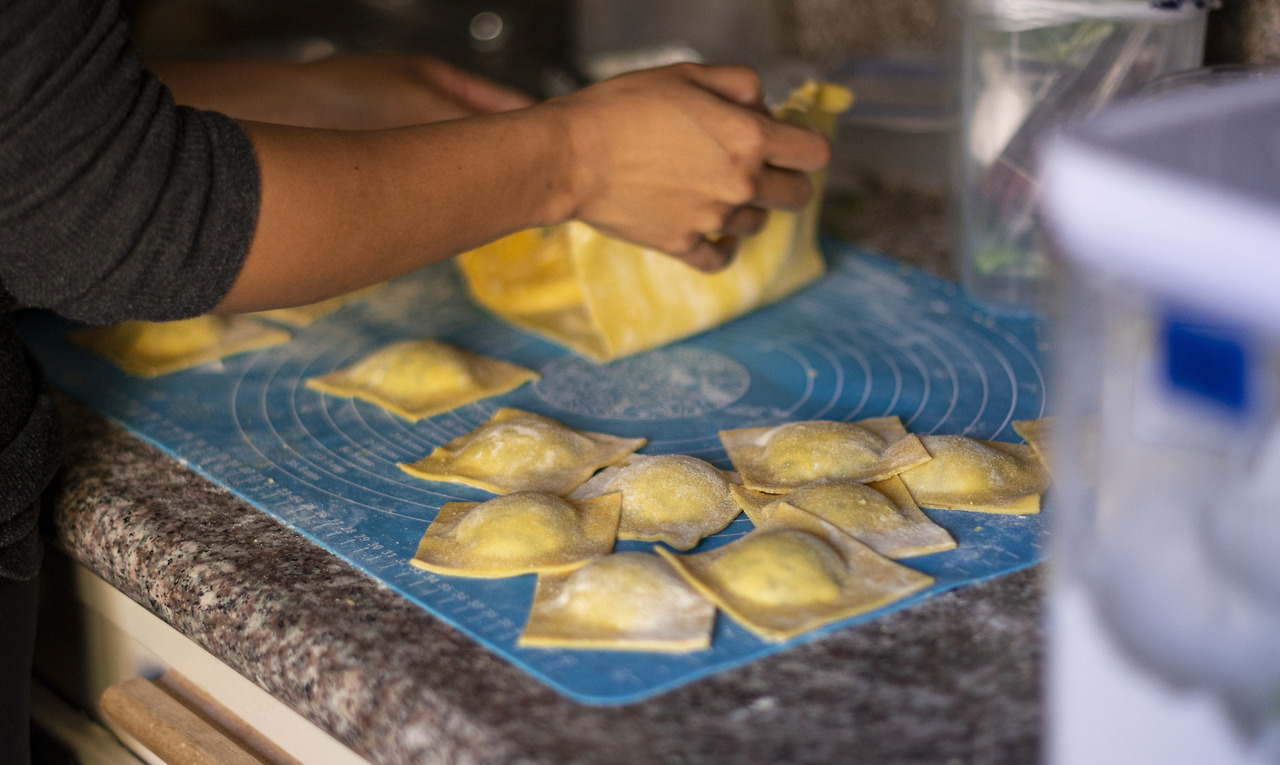 나는 면을 다 만들었으니 아내가 마법의 요리를 시작한다. 집에서 그가 직접 만든 리코타 치즈와 시금치를 섞는다.