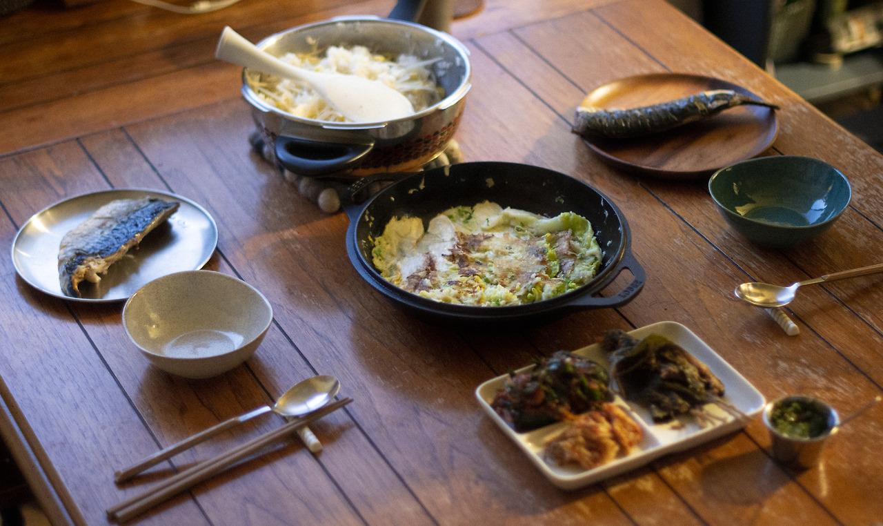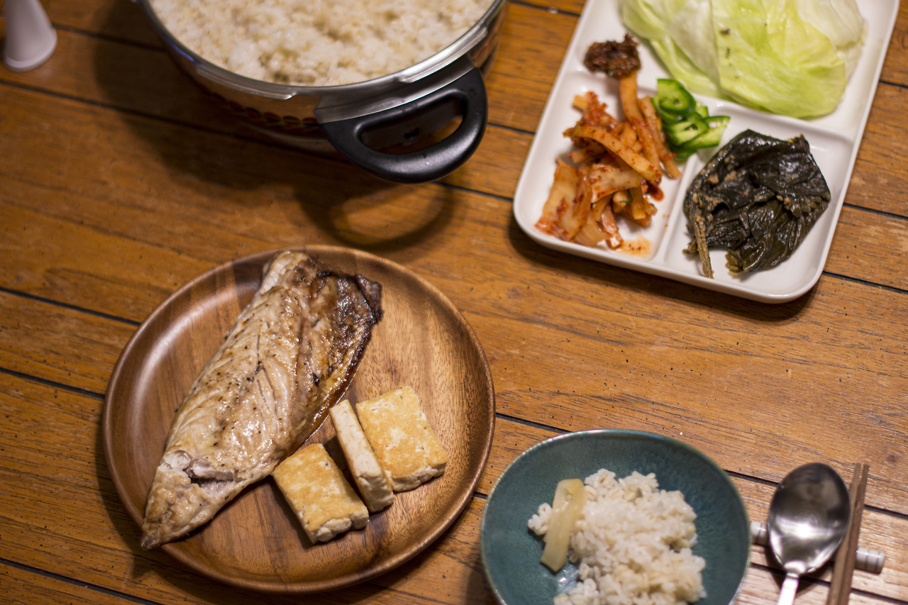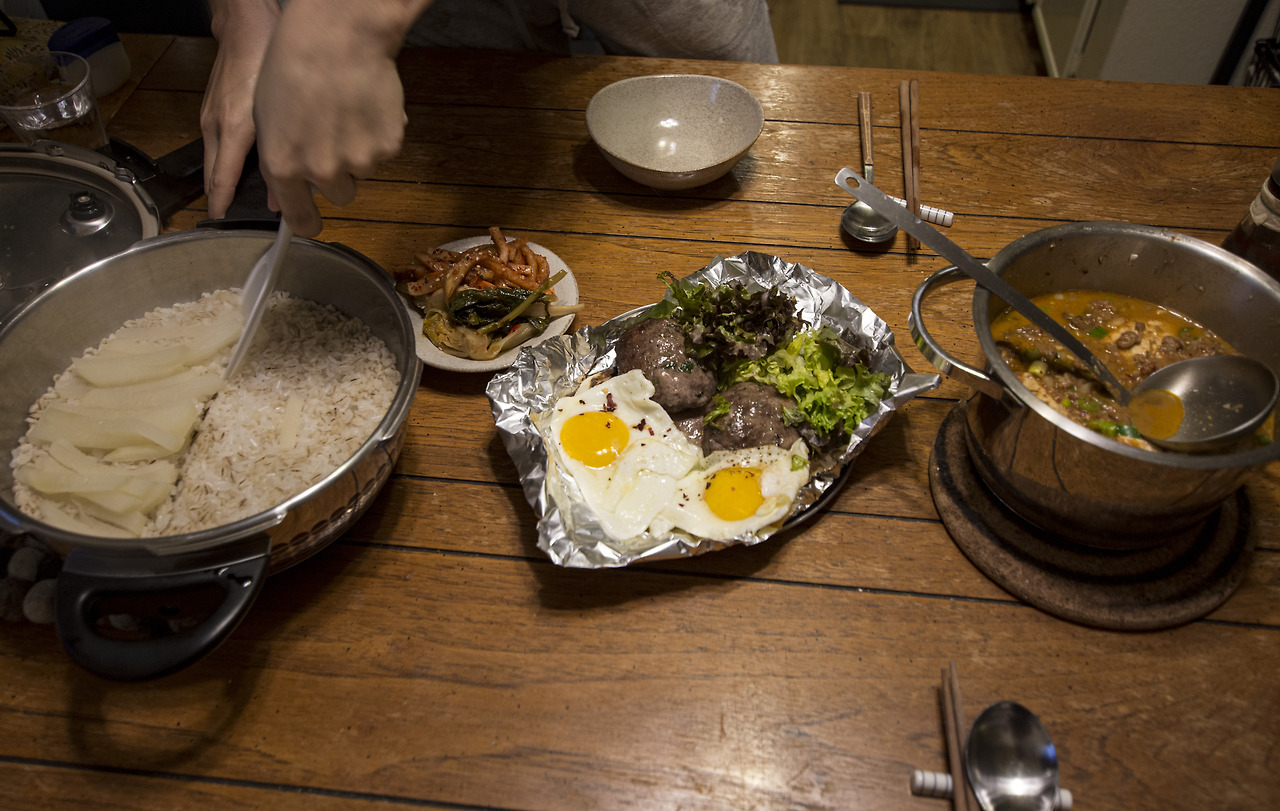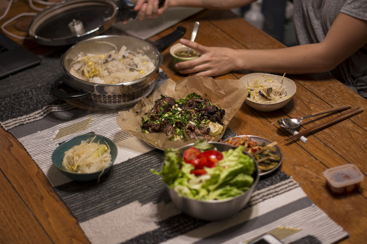 우리가 외식을 하는 경우는 일 년에 다섯 손가락 안에 꼽는다. 그런 의미에서 우리가 하는 모든 식사는 집밥이다. 그리고 우리는 먹고 싶어 하는 것들이 너무나 많아서 일주일의 몇 번씩은 큰 기대를 가지고, 그리고 아내의 솜씨 덕에 그 기대에 걸맞은, 혹은 예상치도 못하게 더욱 커다란 만족감을 가지고 식사를 한다. 짬뽕, 마라탕, 족발, 닭 한 마리, 샤브샤브, 감바스 알 아히요, 마늘 크림 파스타 등등, 끝도 없는 그 특별한 메뉴들의 향연 속에 일상적인 식사도 존재한다. 오늘은 '그냥 [...] 먹자!' 하고 그가 이야기한다. 그것이 우리에겐 '집밥' 같은 느낌이다. 비교적 편하게 먹고, 먹고 나서도 편안하고, 그러나 따뜻하고 포근하며 맛있는, 우리의 집밥. 그 중심에는 주로 압력 냄비에 쌀에 이런저런 것을 같이 올려 지은 밥, 그리고 곁들여지는 소소하지만 충만한 요리와 반찬들이 존재한다.