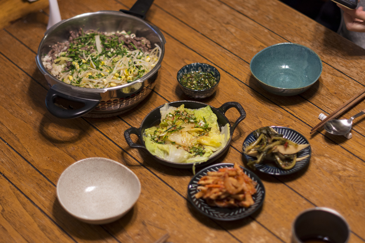 간 고기와 무까지 더해져 아주 깊고, 감칠맛이 넘치고, 시원한 맛의 콩나물 밥. 간장 식초 양념을 얹은 배추찜. 그 달달함, 고소함, 상큼함이 훌륭한 맛의 조화를 보여준다. 그리고 집에서 담근 무생채, 열무김치.