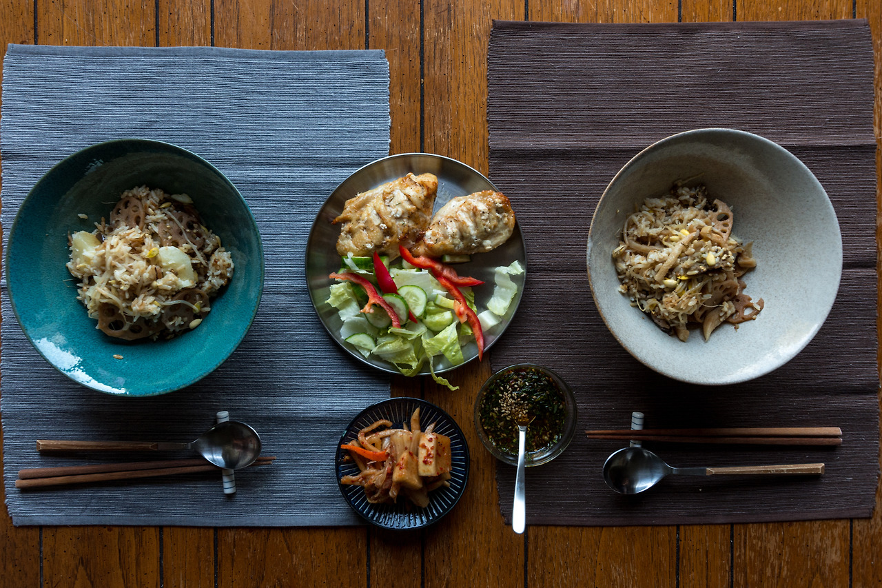 콩나물, 무, 연근 밥. 닭가슴살 샐러드.