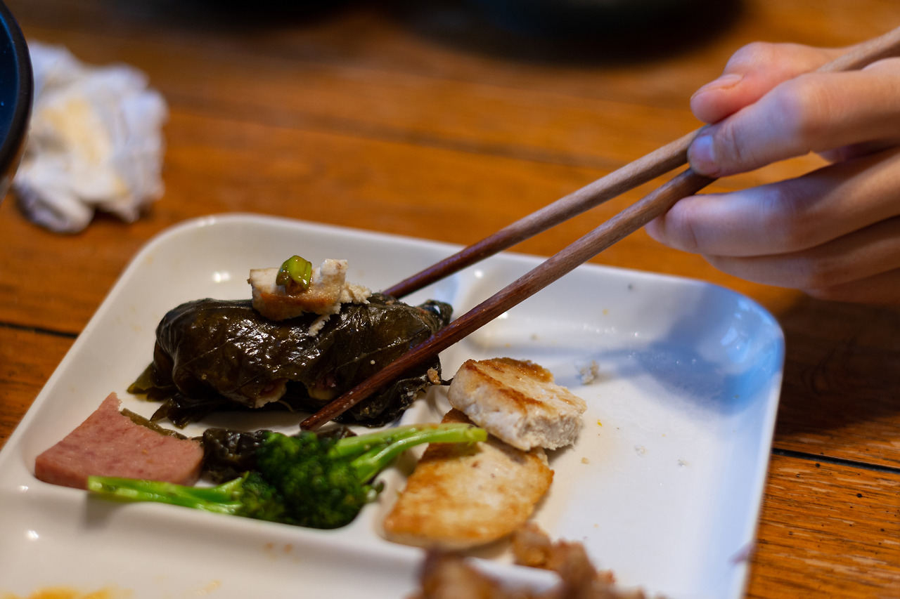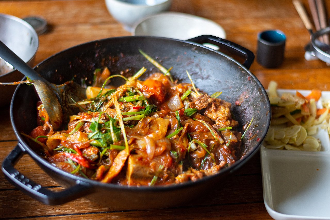다음 날 저녁은 냉동실/냉장고 털이, 매콤한 양념을 더해 토치로 지져낸 불족발, 얼려둔 고로케, 만들어둔 손두부, 어제 먹고 남은 야채 볶음. 족발과 고로케와 손두부가 남아 있는 우리 집 냉장고에 감사하며 밥을 먹었다. 족발에 입혀진 불향, 그 쫄깃하고 탱글한 식감, 보드랍고 바삭하면서 중간중간 씹히는 할라페뇨에 매콤한 고로케, 고소하기 그지없는 구워낸 두부, 거기에 더해지는 아삭한 야채들.
