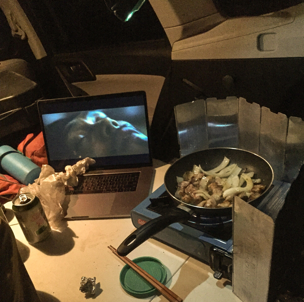 아내가 한국에 잠시 들어간 어느 초가을, 나는 이때다 싶어 클라이밍을 하러 매 주말 온갖 데를 쏘다녔다. 한 번은 집에서 세 시간 정도 거리의 블랙 마운틴 (Black Mountain)에서 1박 2일을 머물렀다. 아내가 없어 대단한 캠핑은 못 하고, 차에다 적당히 매트를 깔고, 침낭 안에서 자기로 했다. 음식도 별 것은 없지만 아내가 한국에 들어가기 전 냉동해둔 수많은 것들 중 삼겹살을 가지고 왔다. 밤이 찾아오자 차가 흔들릴 정도로 세찬 바람이 불어왔고, 브루스타에 불을 유지하기는커녕 브루스타와 소중한 삼겹살이 다 날아갈 것 같았다. 그래서 트렁크만 열어 두고 차 뒤편에 앉아 영화 '광해'를 보면서 그 파란 브루스타에 삼겹살과 양파를 구워 먹었다. 어릴 적, 나의 일기는 늘 뻔하게 '참 재미있었다, '로 끝이 났다. 지금 나의 '글'도 생각해보면 그와 별 다를 것이 없다. 그 날의 클라이밍은 '참 재미있었고, ' 삼겹살도 '참 맛있었다.' 생각해보면 지금 재미있는 일들은 어릴 때 재밌었던 일들이다. 돌을 쌓고, 풀때기를 만지작거리고, 그네를 타고, 비 맞으며 뛰어다니고, 맛있는 것을 먹고... 하여튼, 그렇게 차에 앉아 삼겹살을 구워 먹고 있으려니 어찌나 아내가 보고 싶던지.