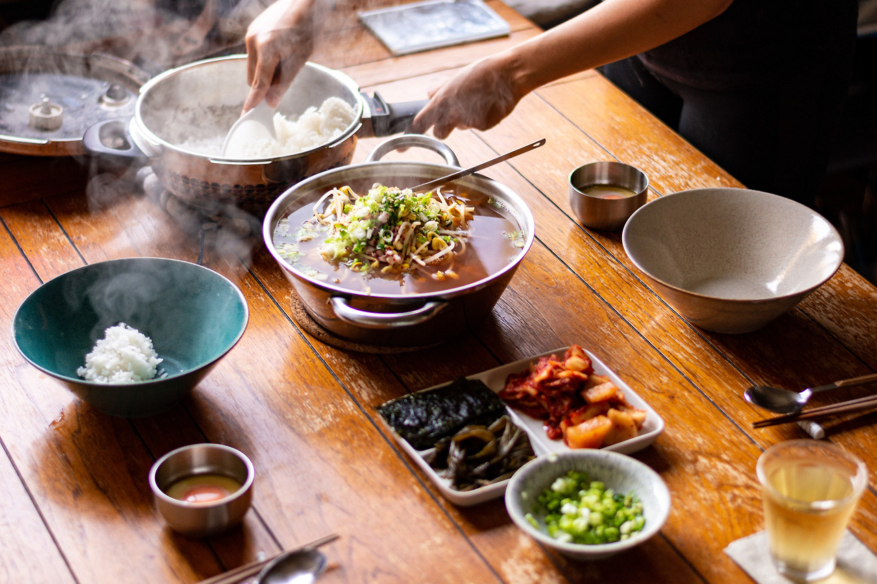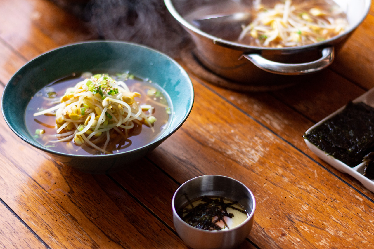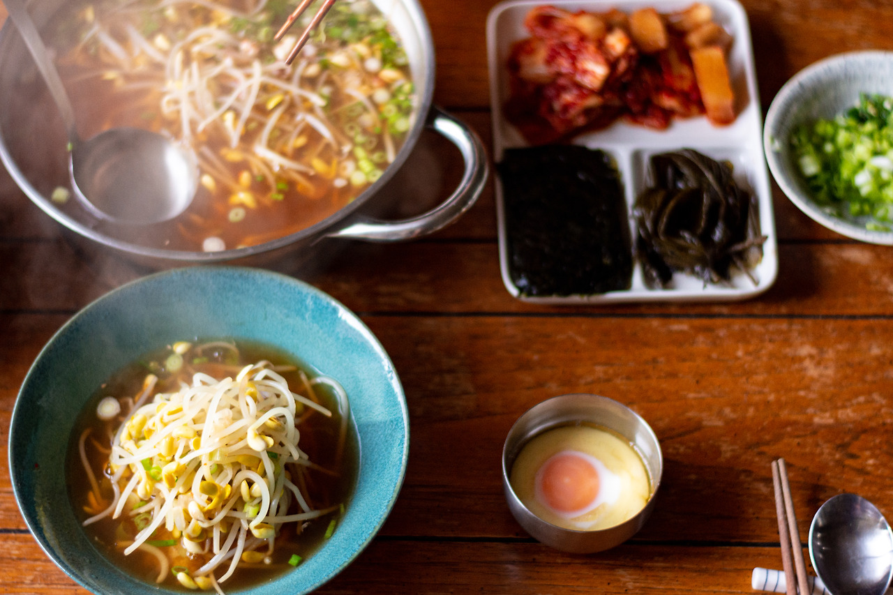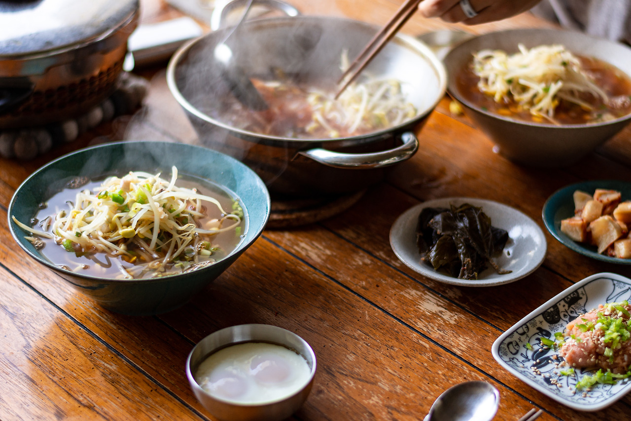 깨끗한 숟가락을 들어 김이 잔뜩 올라간 수란을 한 숟갈 뜨면 참기름 냄새가 확, 올라온다. 아내가 여기만큼은 한국에서 보내져 온 '비싼' 참기름을 아낌없이 올린다. 매끄러운 계란의 질감과 그것을 감싸고 있는 더 부드러운 참기름의 식감, 김의 바삭함, 고소함, 감칠맛이 입에서 섞이고 있으려면 삼키기가 아까워진다. 아쉬움을 달래며 콩나물 국밥의 국물을 몇 숟가락 떠 넣어 섞은 뒤 수란을 두 숟가락 째 먹으면, 또 다른 세상이 펼쳐진다. 국밥 국물의 그 시원함이 더해져, 어서 국밥을 제대로 푹푹 떠서 먹고 싶어지는 것이다. 그래서 국밥 국물만 떠먹어보니 역시 '크어어어어!' 너무나 시원하고 개운하며 입에 감긴다. 아내의 국물은 날이 갈수록 복잡해서 그 맛의 근원을 구분할 수가 없어진다. 기본적으로는 다시마에, 그가 그동안 버섯, 새우, 멸치 등 잘 말려서 빻아 만든 천연 조미료를 넣었다고 한다. 그리고 콩나물을 정말, 아낌없이 팍팍 넣고 끓이면 이런 맛이 난다고 했다. 거기에 점점 우러나며 국물을 매콤하게 하는 세라노 고추, 중간중간 씹히는 쫄깃한 오징어 조각들. 딱히 숙취가 없는 날이었지만, 피곤한 이 세상으로부터 속이 풀리는 것만 같았다.