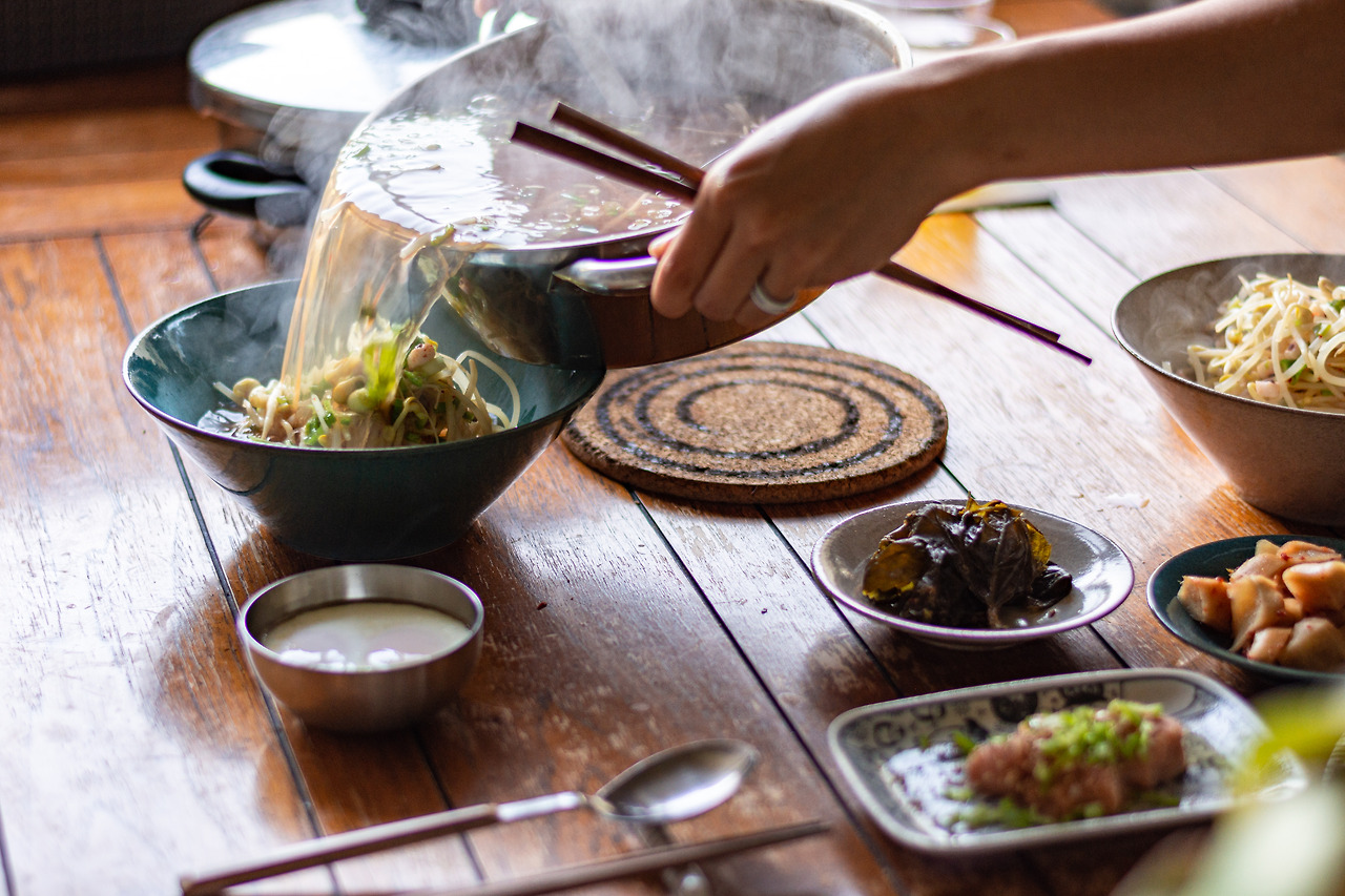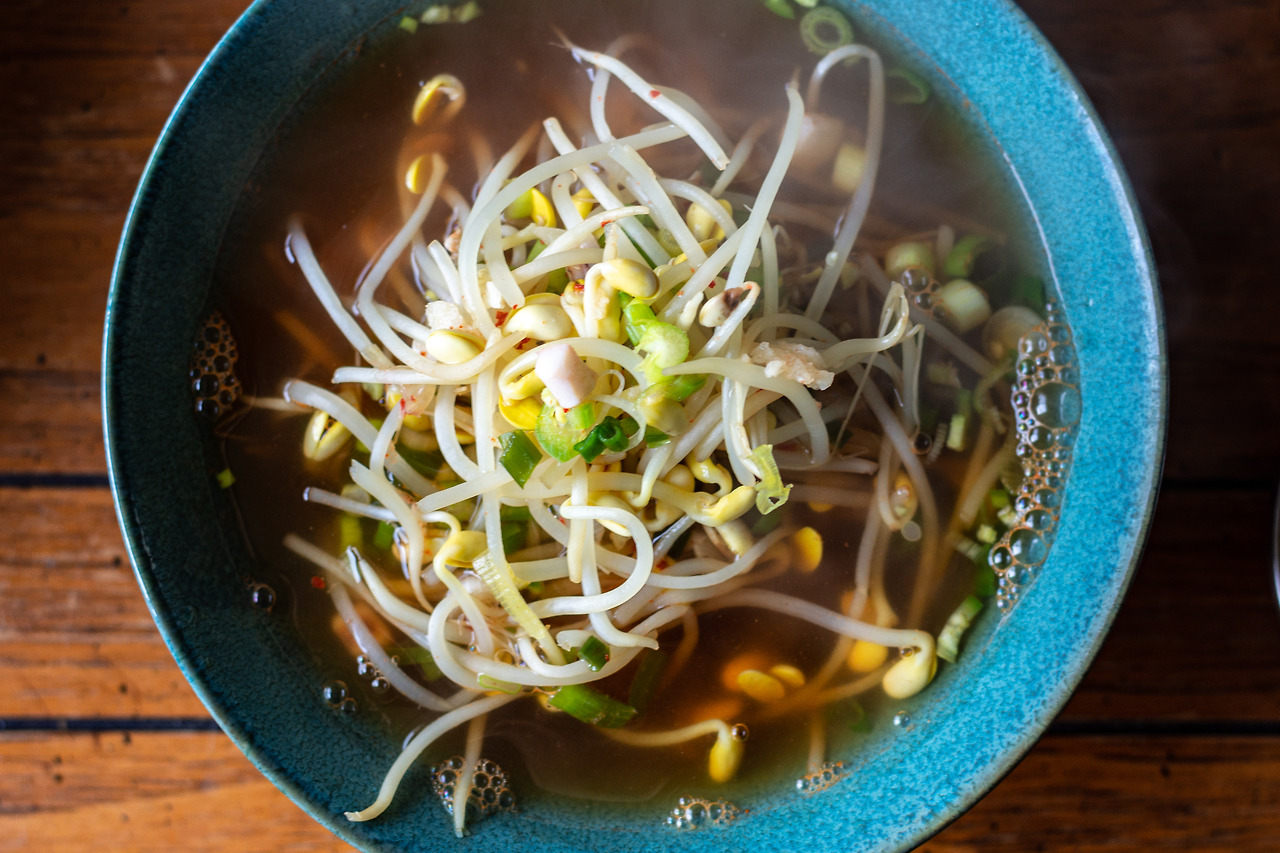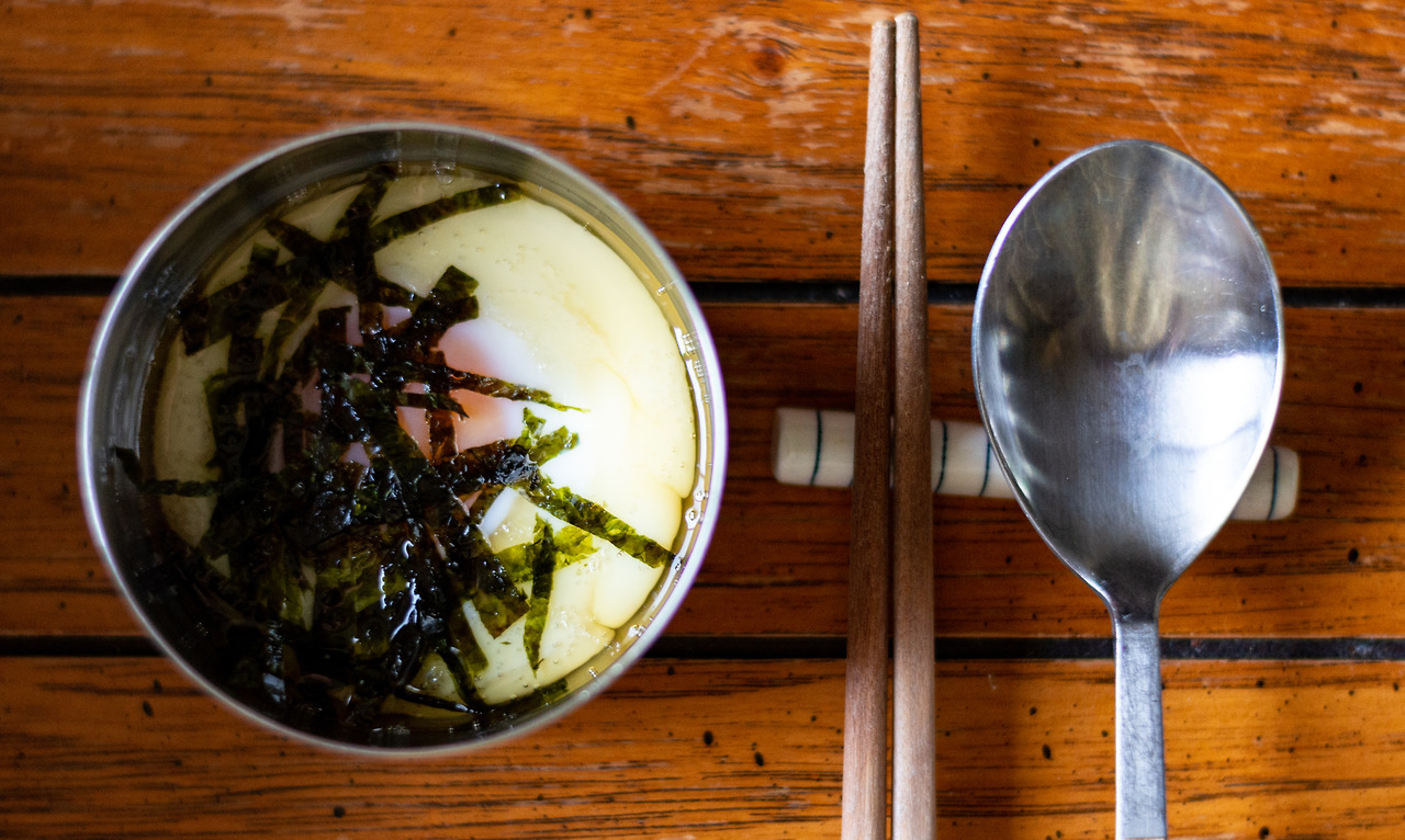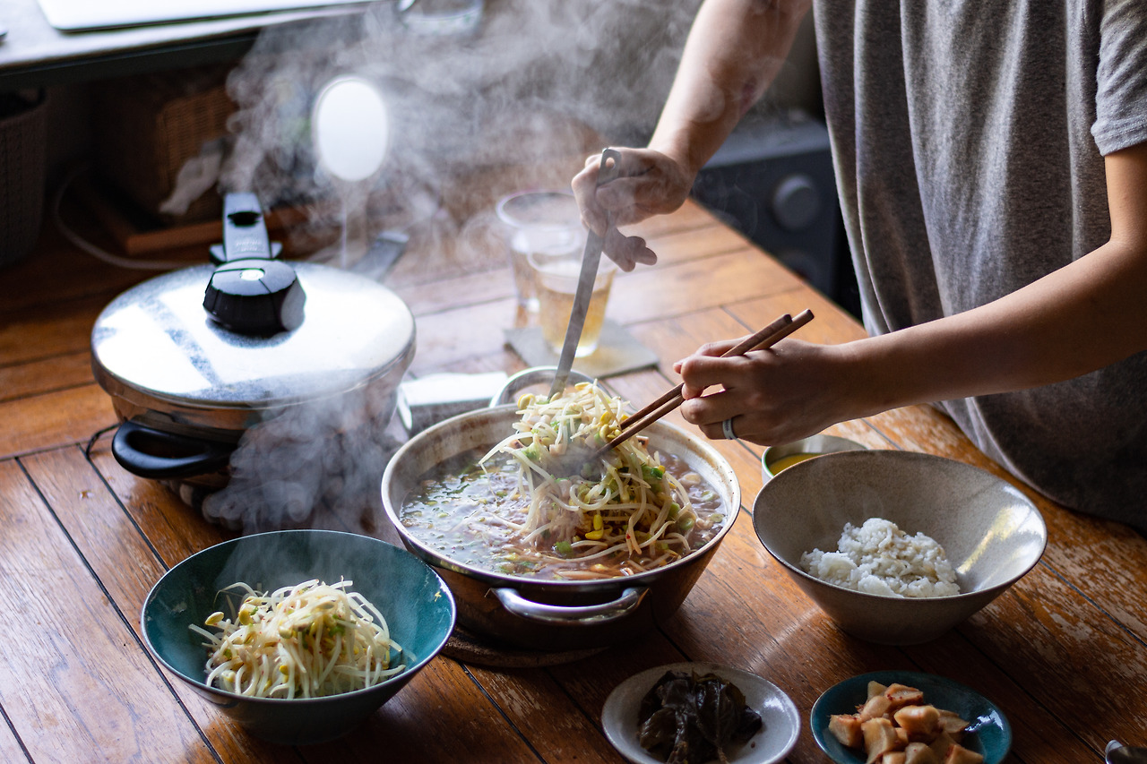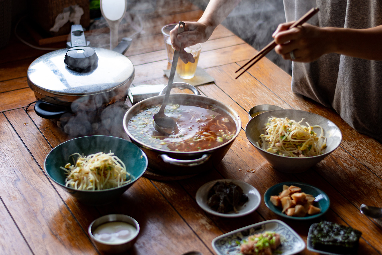 깨끗한 숟가락을 들어 김이 잔뜩 올라간 수란을 한 숟갈 뜨면 참기름 냄새가 확, 올라온다. 아내가 여기만큼은 한국에서 보내져 온 '비싼' 참기름을 아낌없이 올린다. 매끄러운 계란의 질감과 그것을 감싸고 있는 더 부드러운 참기름의 식감, 김의 바삭함, 고소함, 감칠맛이 입에서 섞이고 있으려면 삼키기가 아까워진다. 아쉬움을 달래며 콩나물 국밥의 국물을 몇 숟가락 떠 넣어 섞은 뒤 수란을 두 숟가락 째 먹으면, 또 다른 세상이 펼쳐진다. 국밥 국물의 그 시원함이 더해져, 어서 국밥을 제대로 푹푹 떠서 먹고 싶어지는 것이다. 그래서 국밥 국물만 떠먹어보니 역시 '크어어어어!' 너무나 시원하고 개운하며 입에 감긴다. 아내의 국물은 날이 갈수록 복잡해서 그 맛의 근원을 구분할 수가 없어진다. 기본적으로는 다시마에, 그가 그동안 버섯, 새우, 멸치 등 잘 말려서 빻아 만든 천연 조미료를 넣었다고 한다. 그리고 콩나물을 정말, 아낌없이 팍팍 넣고 끓이면 이런 맛이 난다고 했다. 거기에 점점 우러나며 국물을 매콤하게 하는 세라노 고추, 중간중간 씹히는 쫄깃한 오징어 조각들. 딱히 숙취가 없는 날이었지만, 피곤한 이 세상으로부터 속이 풀리는 것만 같았다.